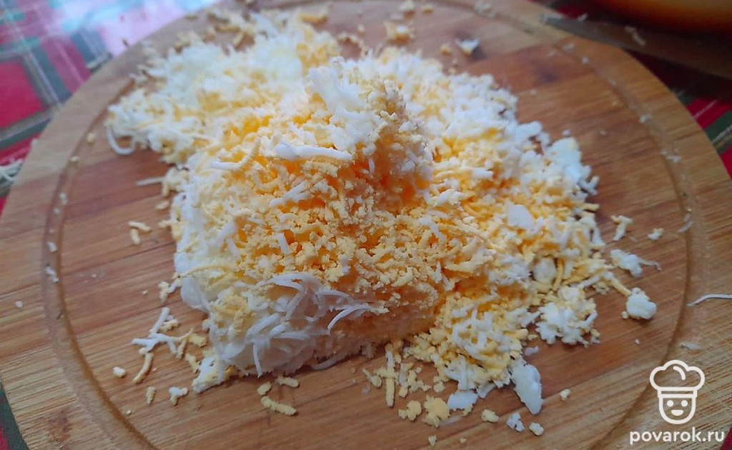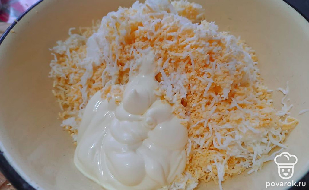 Перекладываем все в миску и добавляем майонез. Еще можно добавить чеснок, но это уже по желанию.