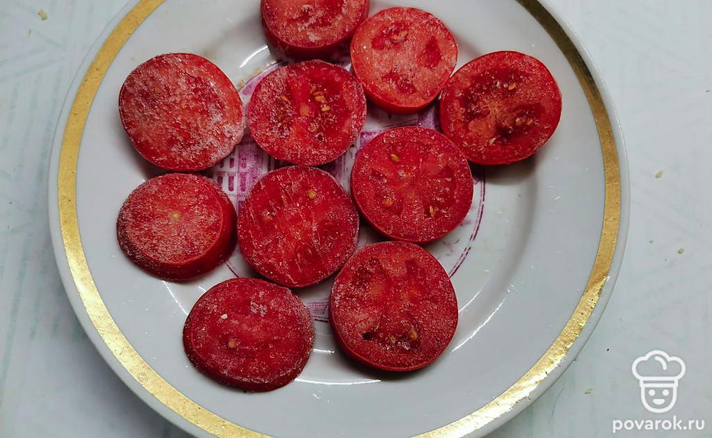 Помидоры нарезать кружочками. У меня были замороженные.