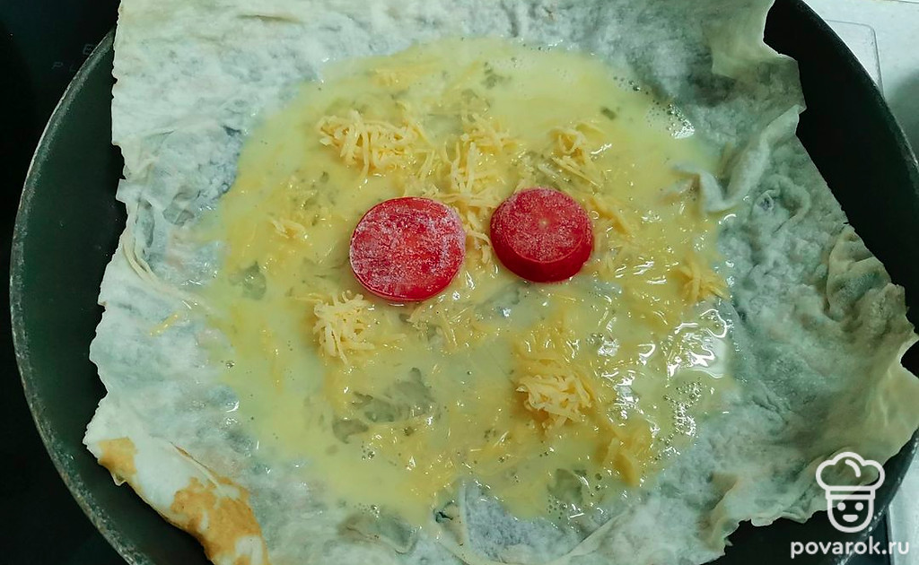 На каждый кусок лаваша использовать по одному яйцу. Яйцо посолить и слегка взбить.