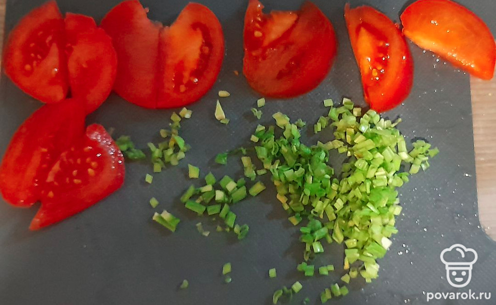 Нарезать полукольцами помидоры. Зеленый лук нашинковать мелко.