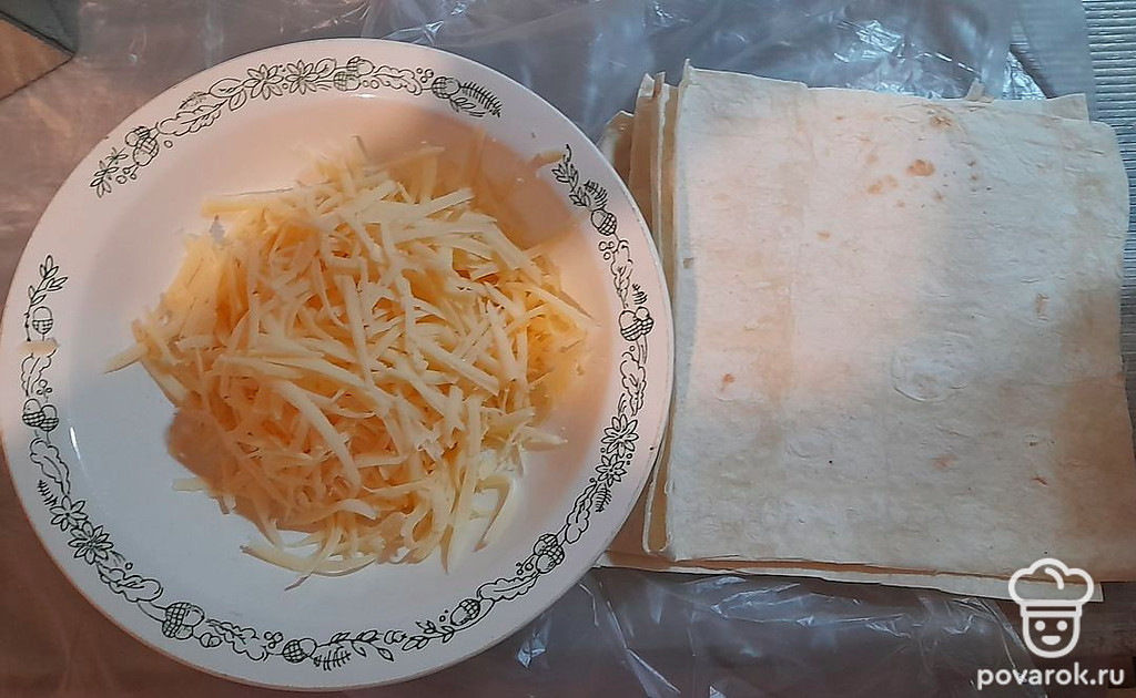 Сыр натереть на терке. Листы лаваша разрезать на небольшие квадраты.