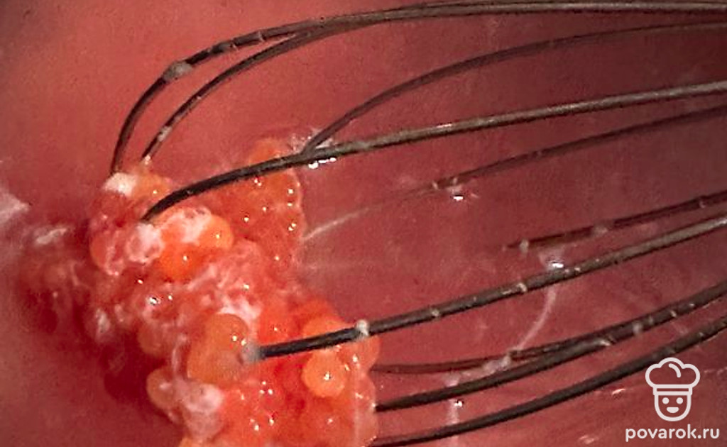 С помощью венчика хорошо перемешиваем икру, чтобы все пленочки от икры оставались на венчике.
