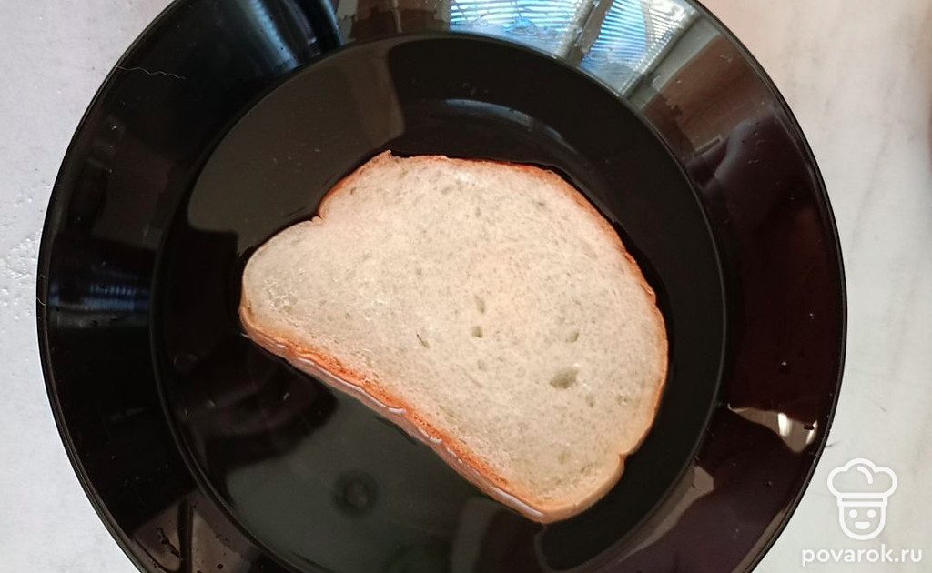 Ломтик хлеба опускаем в тарелку. Смачиваем с двух сторон, немного даем воде стечь, немного отжимаем.
