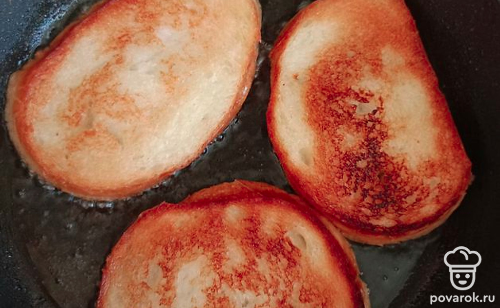 В разогретую сковороду выкладываем наши ломтики. Даем обжариться сначала с одной стороны.