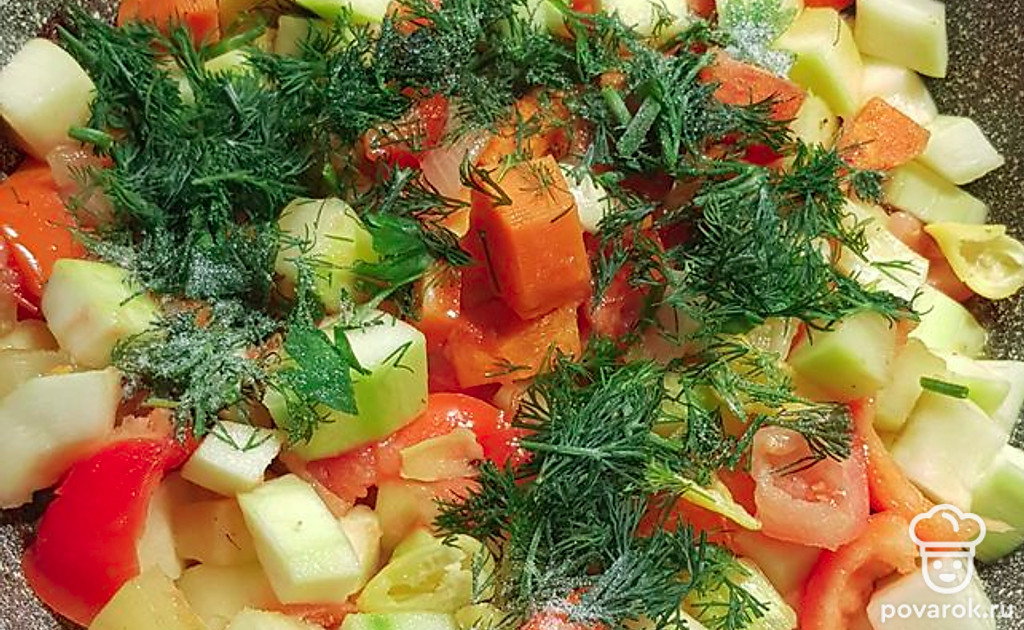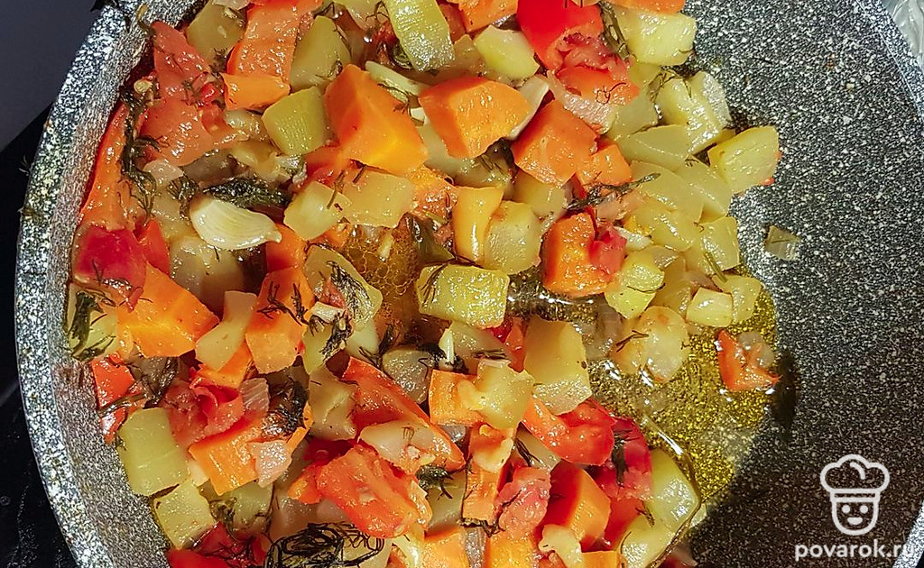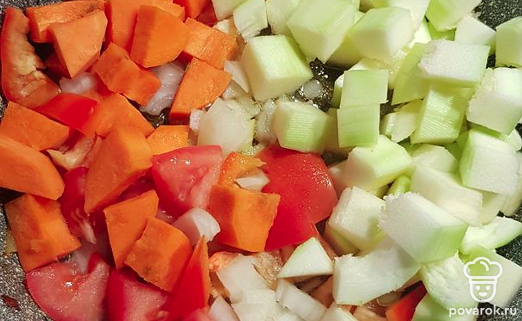 Чистим, нарезаем овощи, обжариваем 15 минут.
