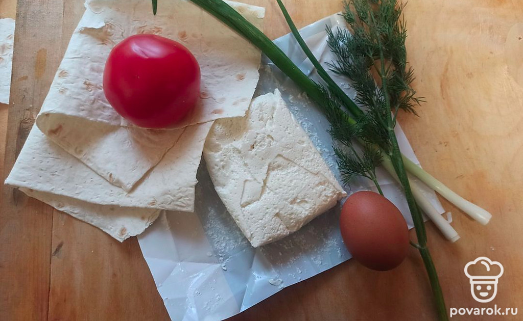 Рулет из тонкого лаваша с творогом, яйцом, помидором и зеленью