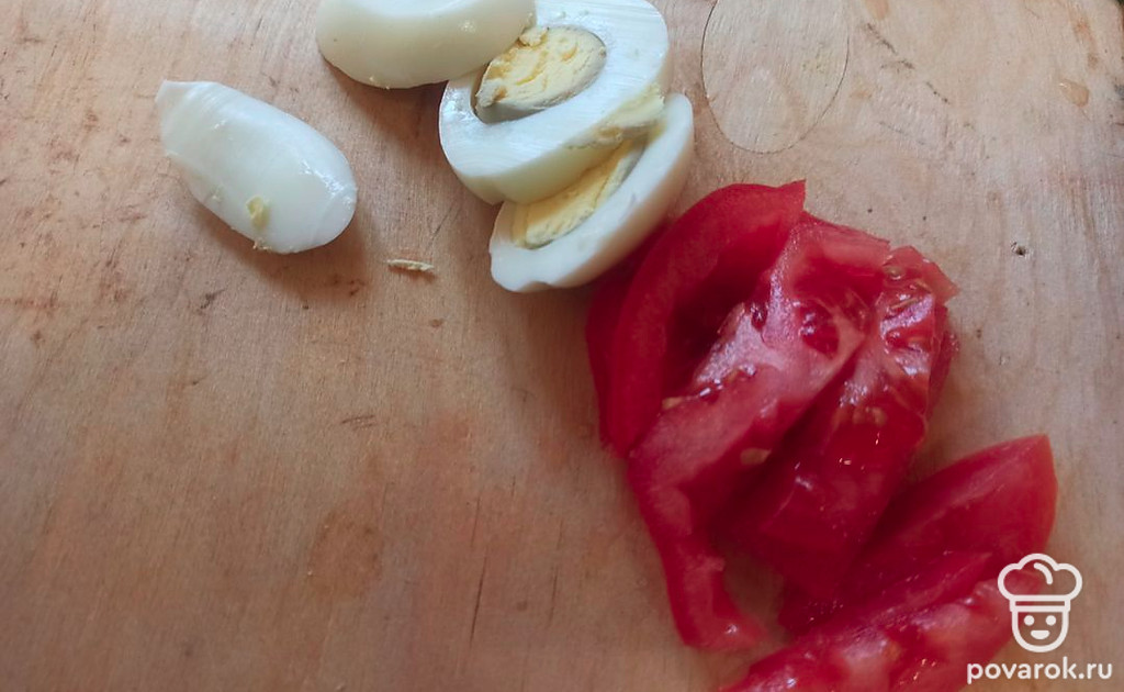 Помидор и яйцо нарежьте тонкими ломтиками.