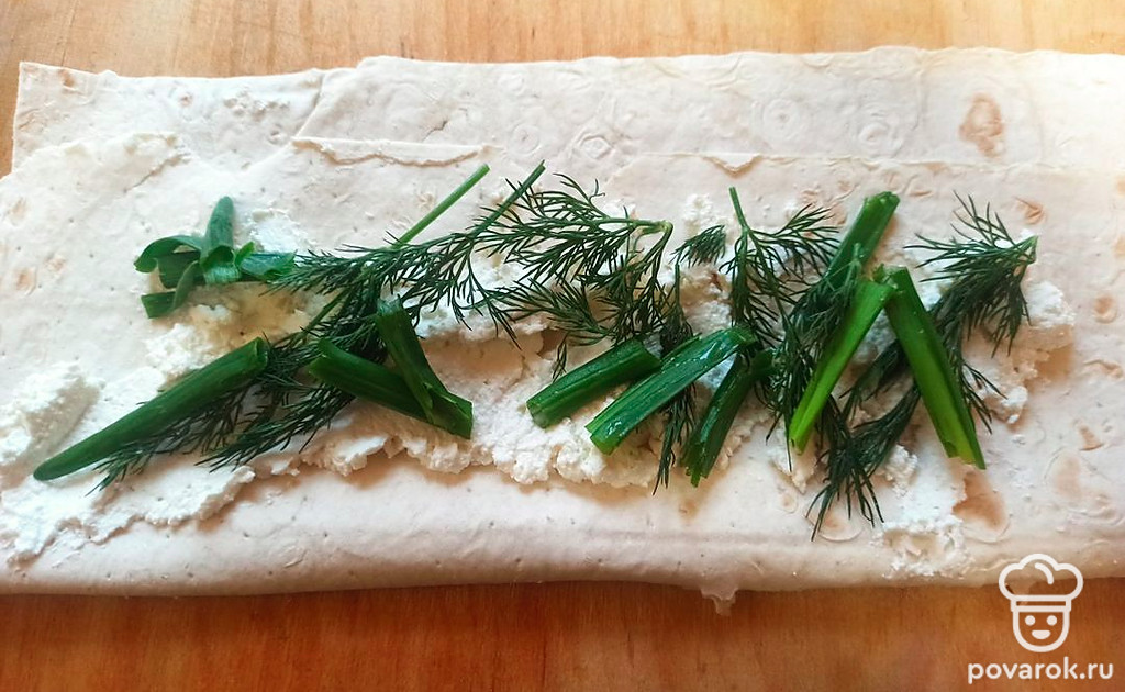 Намажьте лаваш творогом, сверху выложите зелень, нарезанную крупными ломтиками (как на фото).
