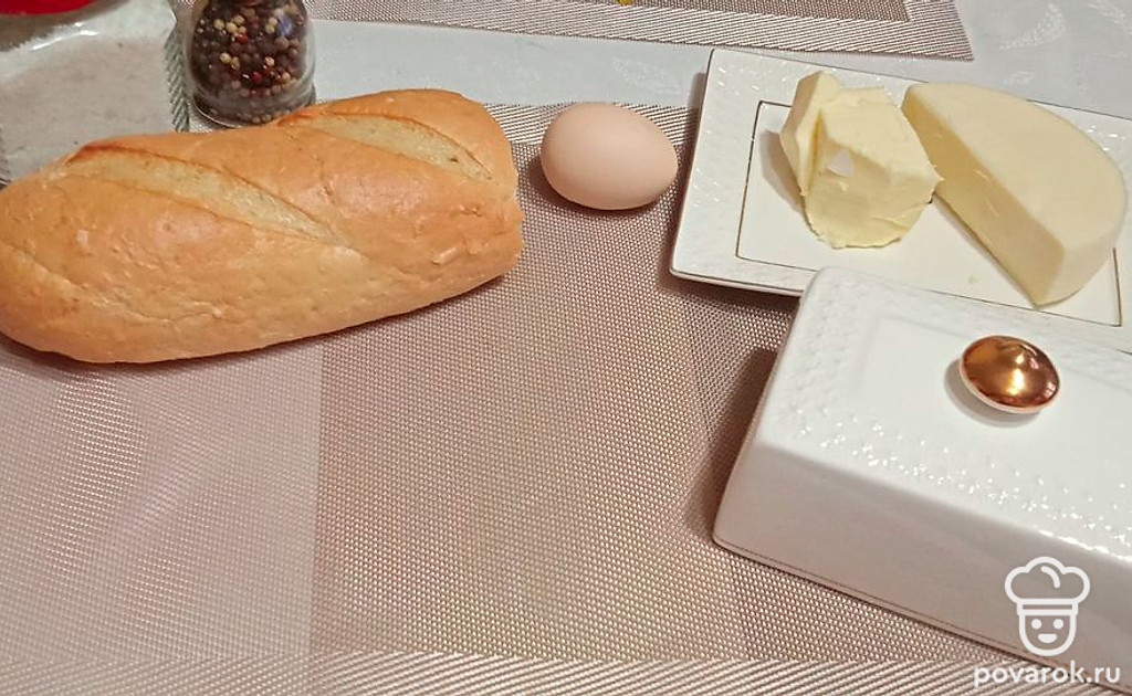 Подготавливаем все ингредиенты. Нам понадобится батон, яйцо, масло сливочное, сыр, соль, перец.