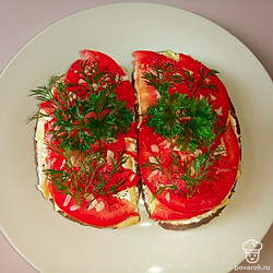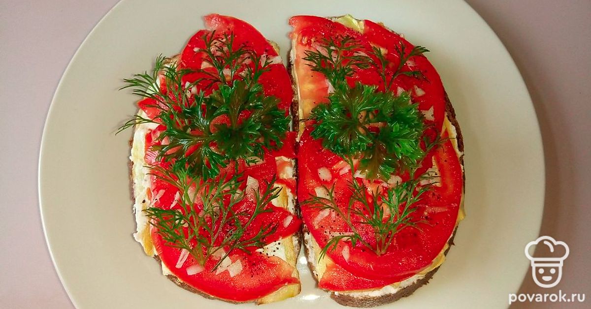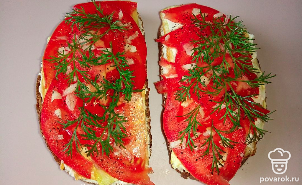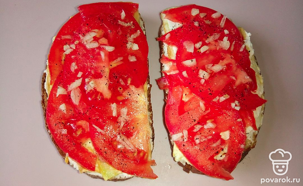 Выложите помидоры на бутерброд. Посолите и поперчите помидоры, посыпьте измельченным чесноком.