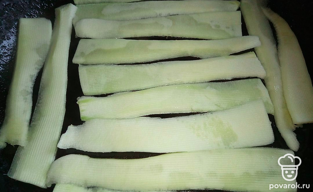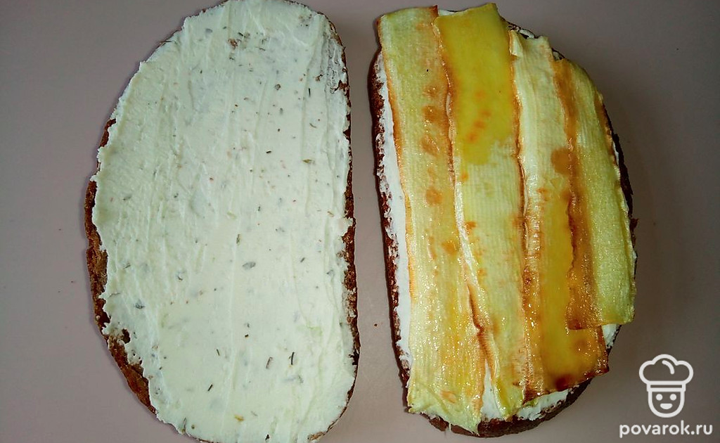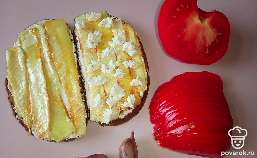Добавьте небольшое количество творожного сыра в виде небольших капель на обжаренные полоски кабачка. Помидор нарежьте тонкими половинками кружков. Чеснок очистите и мелко нарежьте.