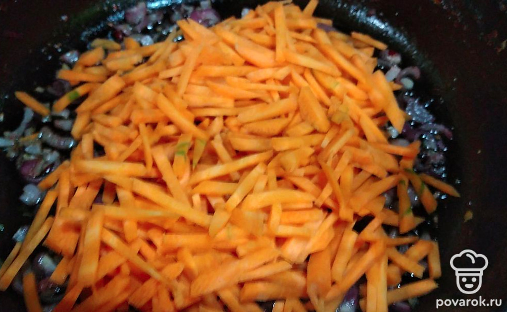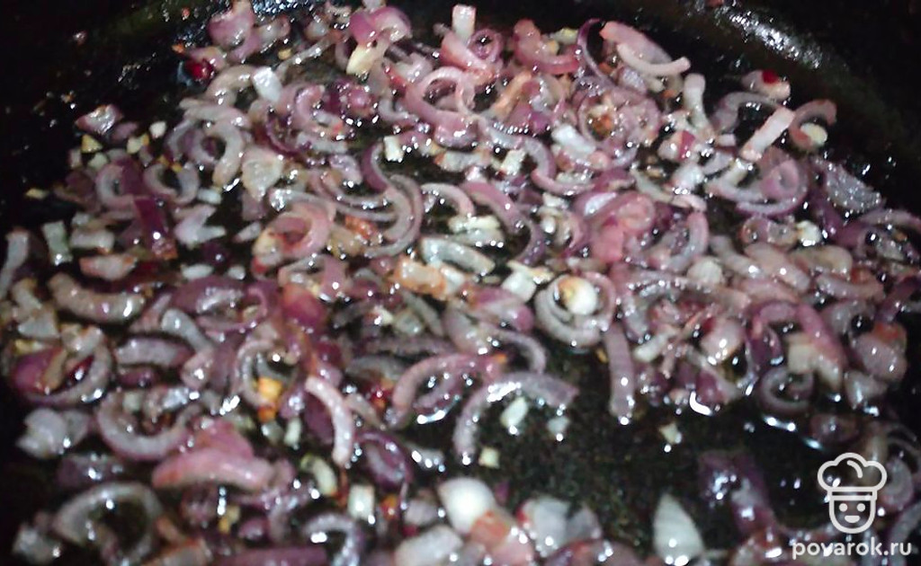 Лук нарезать, обжарить на растительном масле до прозрачности.