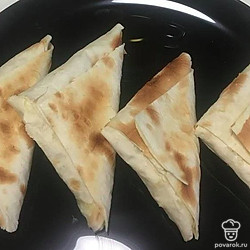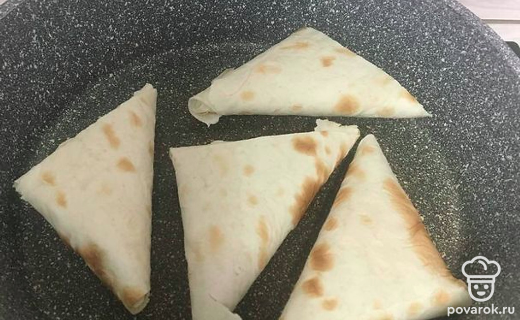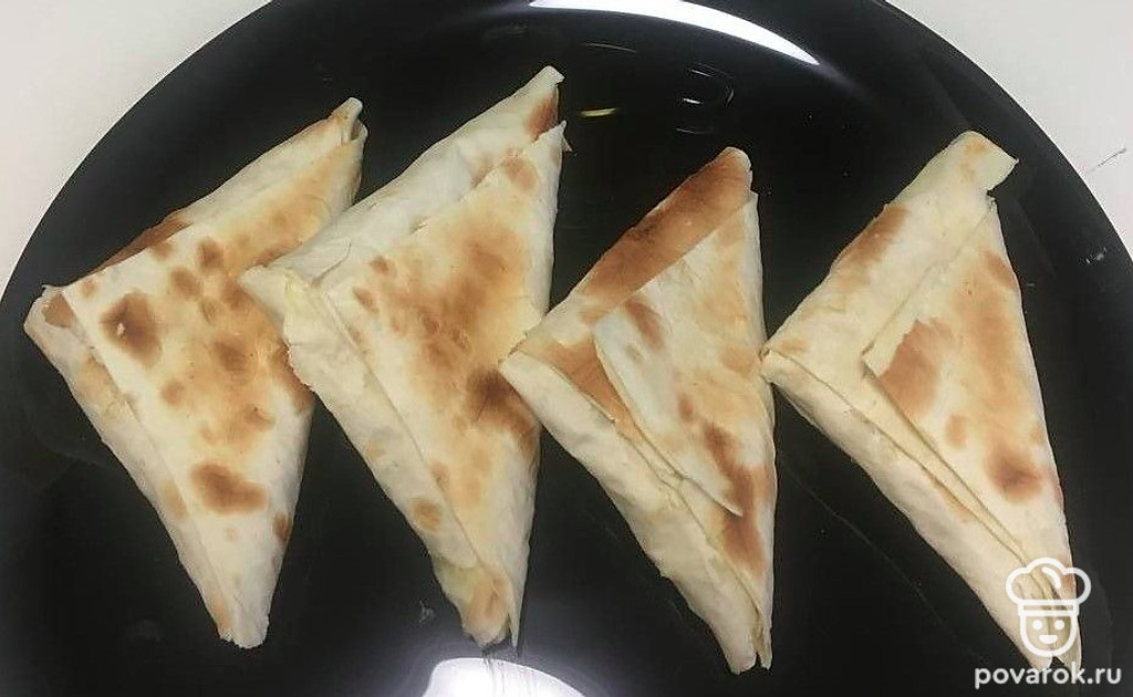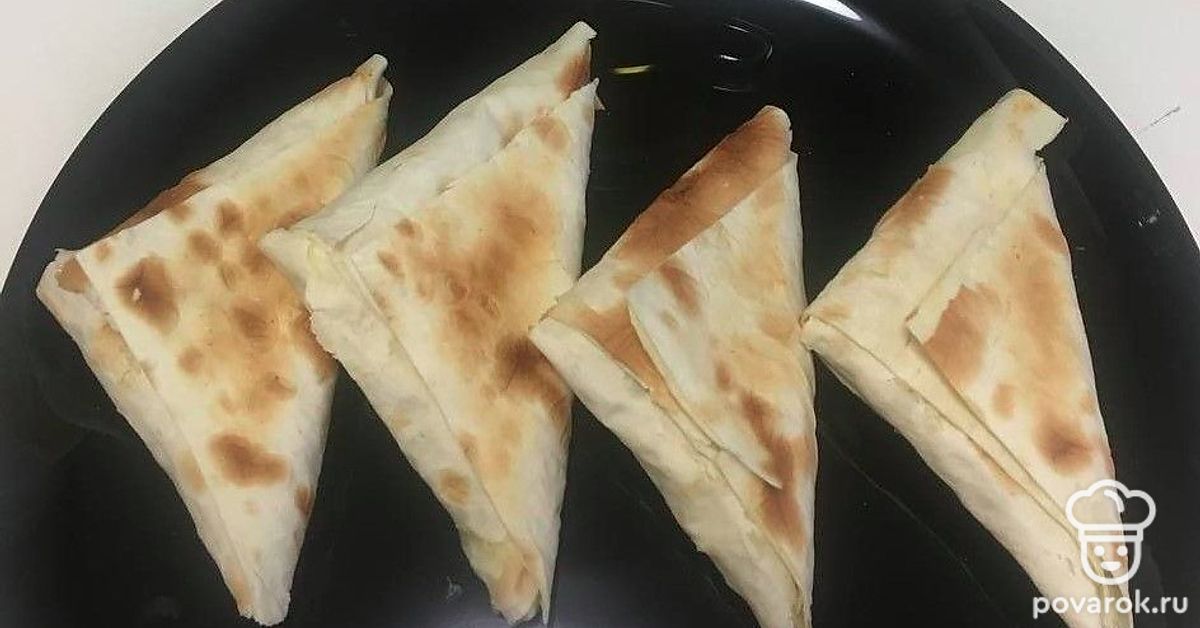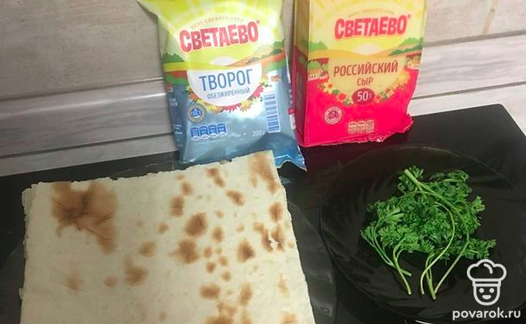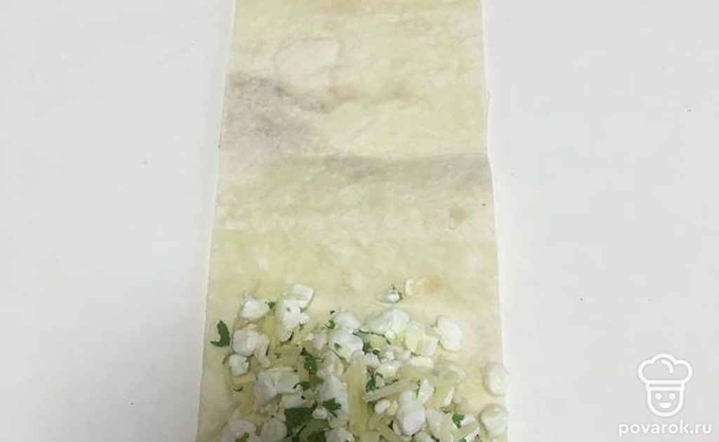 Лаваш разрезаем на полоски. Выкладываем начинку на лаваш, заворачиваем в конвертики.