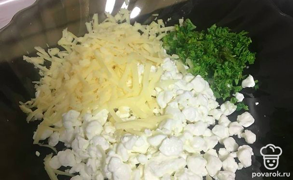 Сыр натираем на крупной терке, чеснок мелко рубим. В миску отправляем творог, сыр, зелень. Тщательно смешиваем.