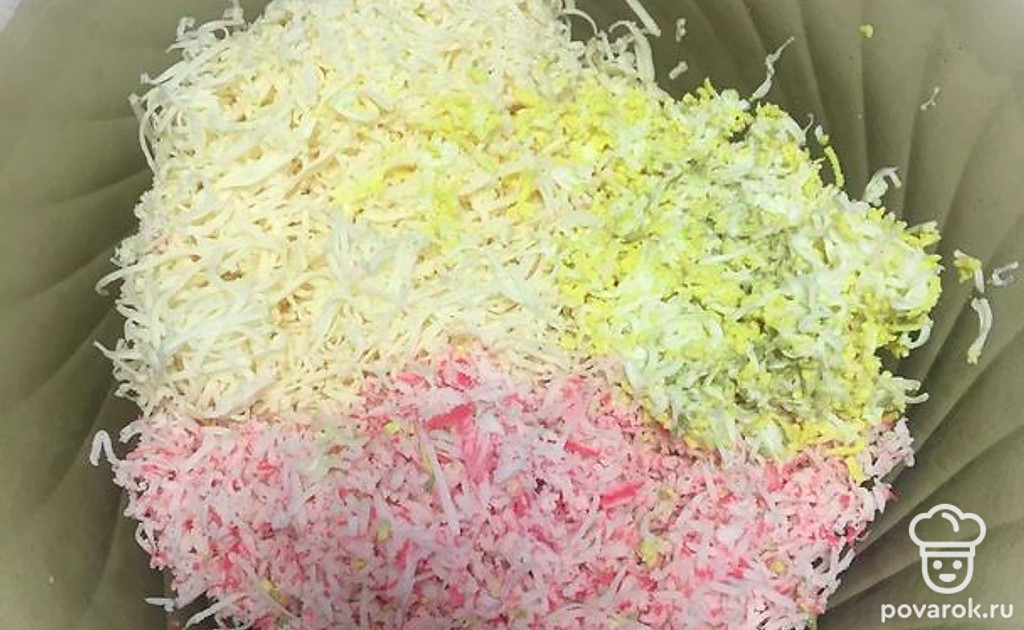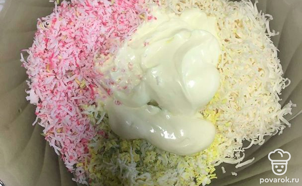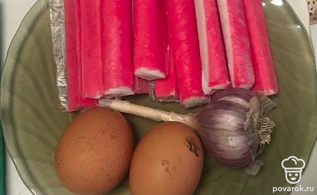 Яйца отвариваем. Плавленый сыр, яйца, крабовые палочки натираем на мелкой терке. Чеснок измельчаем.