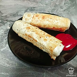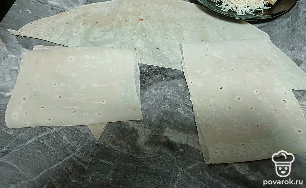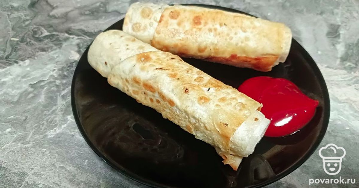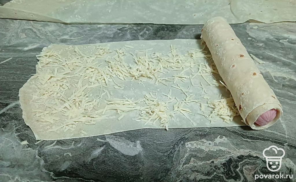 На полоску лаваша выложите тертый сыр, сосиску выложите с краю. И сверните в плотный рулетик.