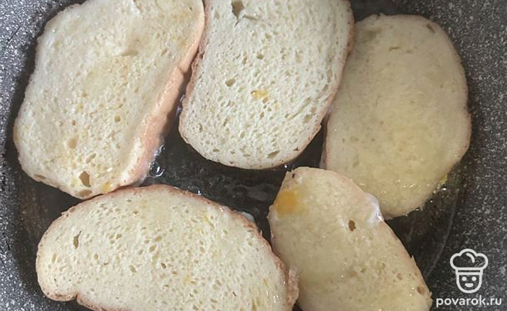 Жарить гренки с маслом по 1 минуте с каждой стороны.