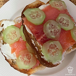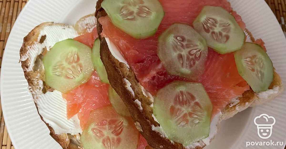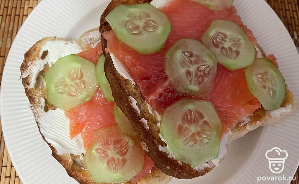 Тосты с творожным сыром, слабосоленой семгой и огурцом
