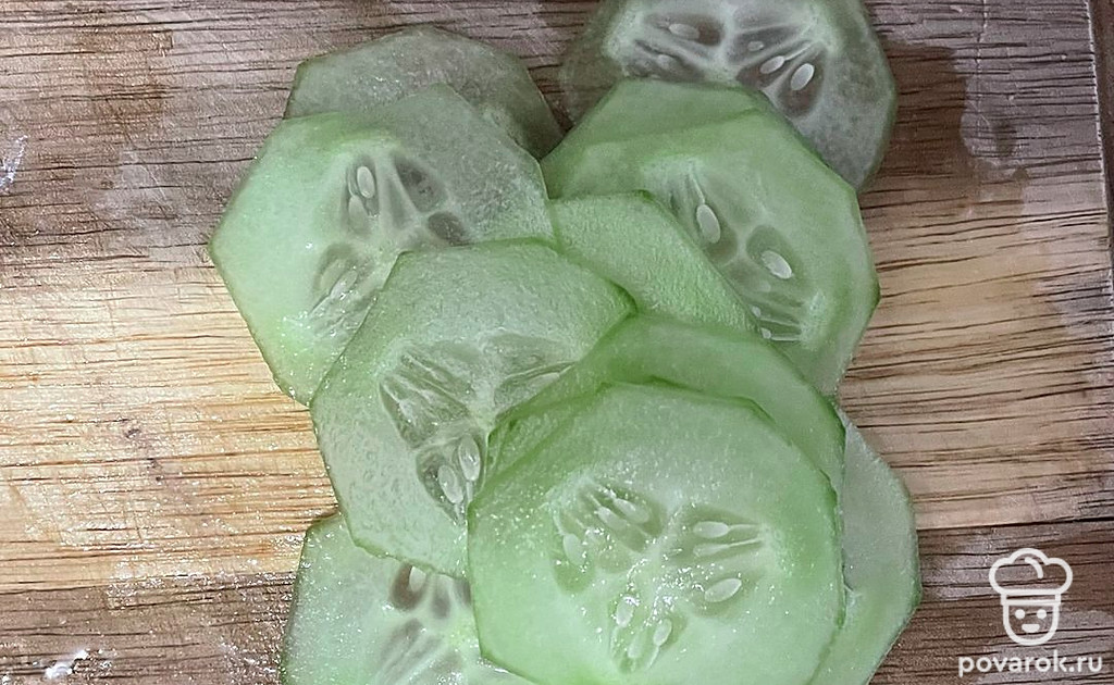 Очистите огурец и нашинкуйте кружочками. Выложите ломтики рыбы и огурца на тост.