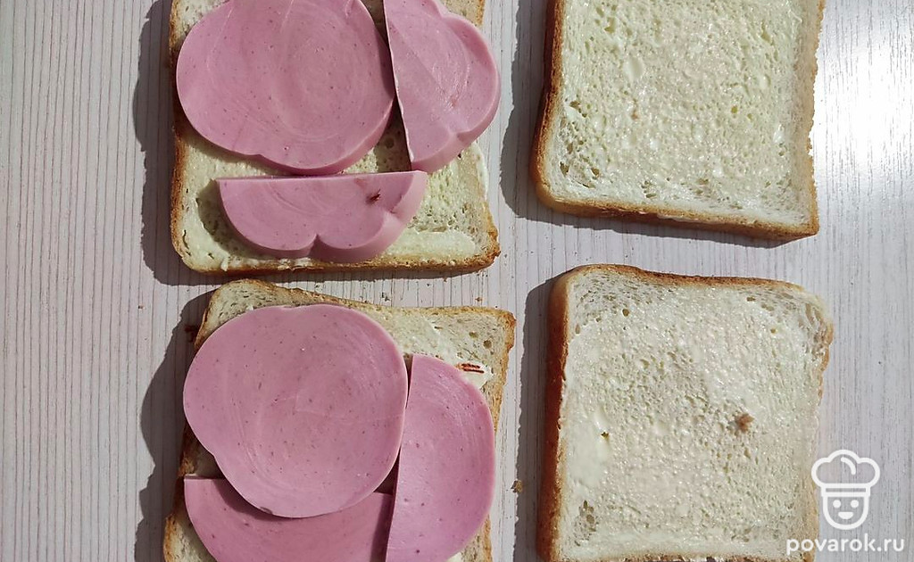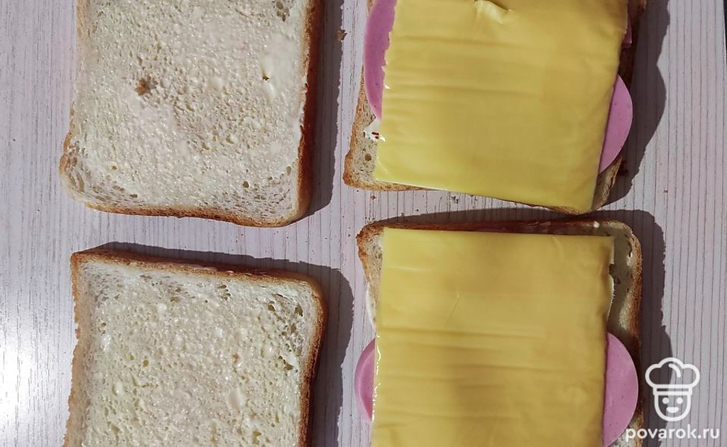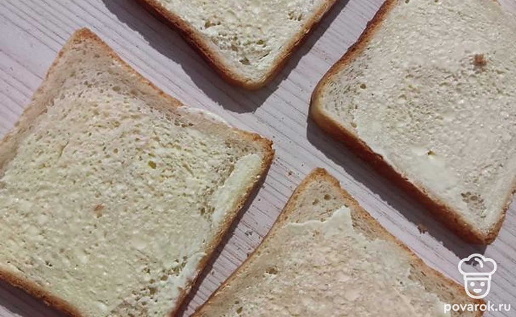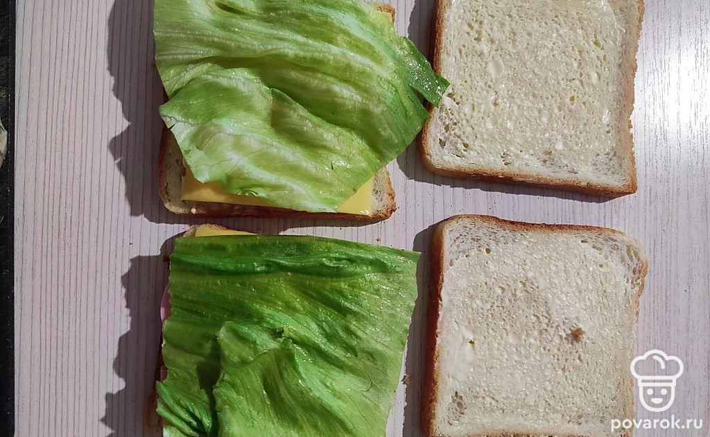 Последним выложить лист салата. Накрыть сверху оставшимися ломтиками хлеба.