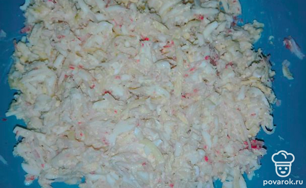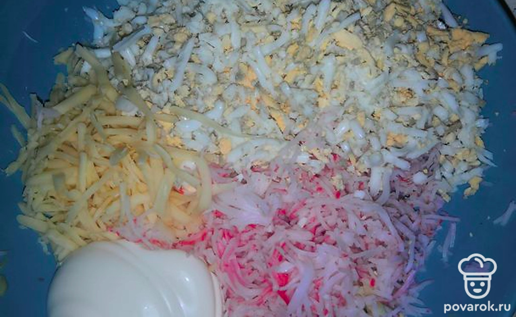 Натереть на терке сыр, яйца, крабовые палочки. Добавить майонез.