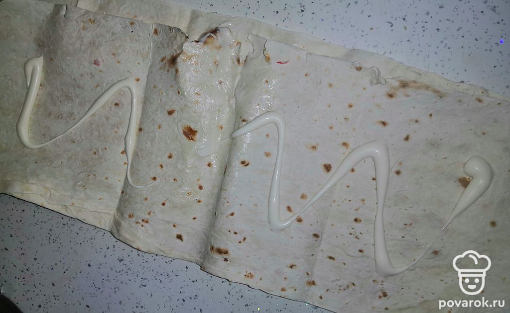 Лаваш разделить на 2 части и смазать майонезом каждую.