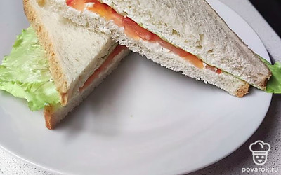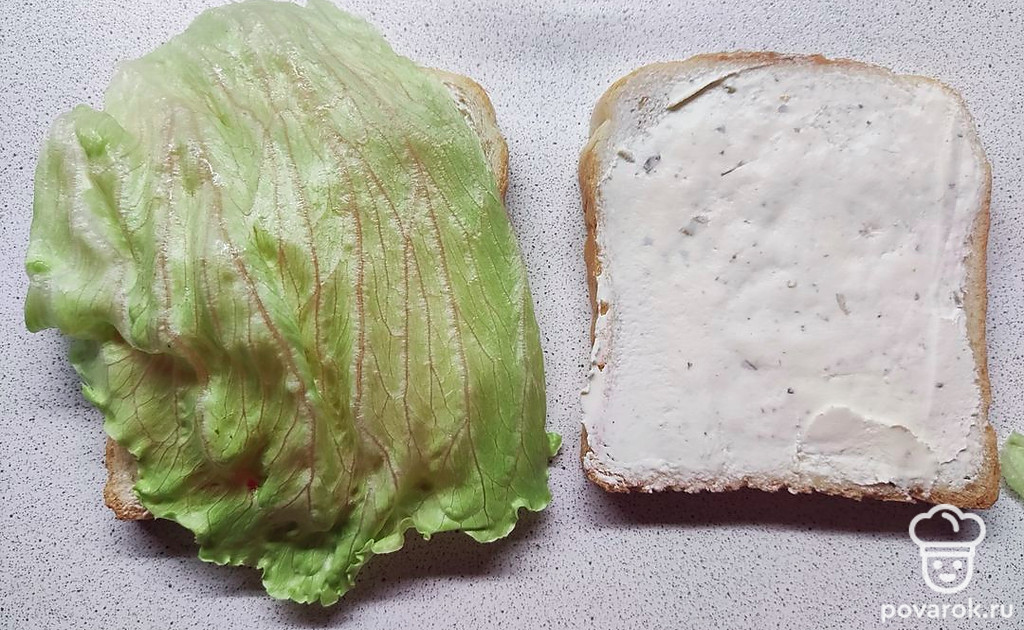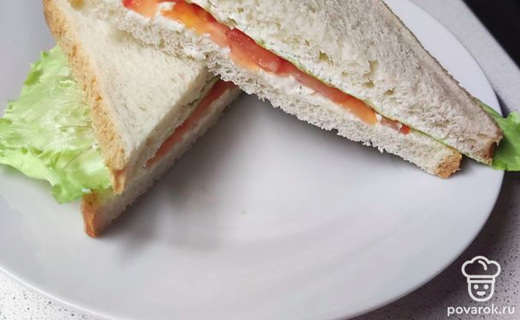 На помидоры выожить лист салата и накрыть вторым кусочком хлеба.