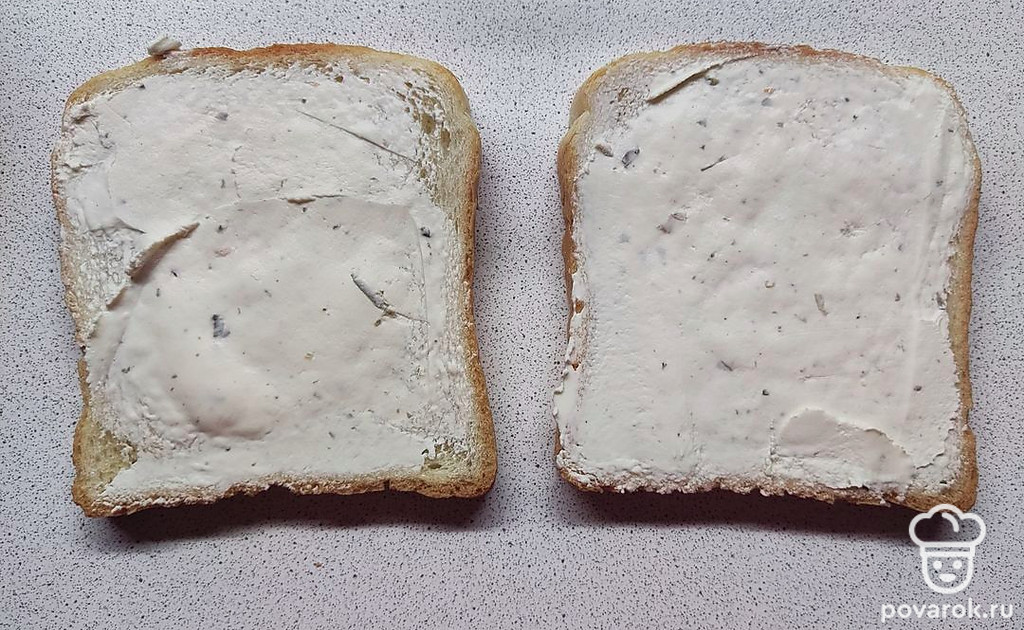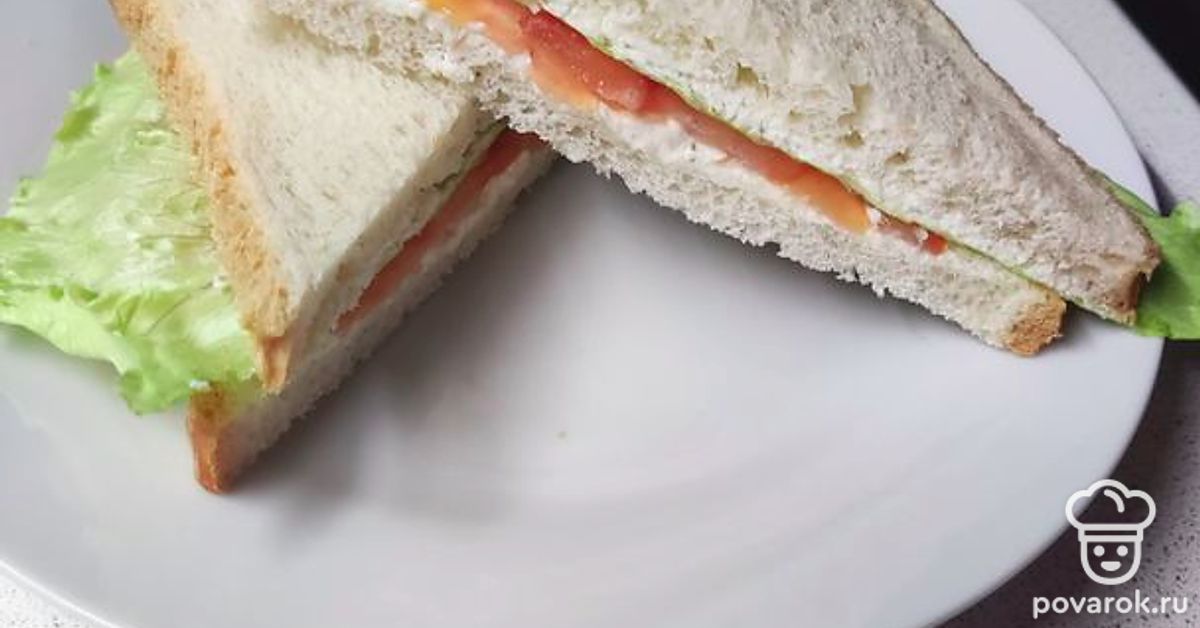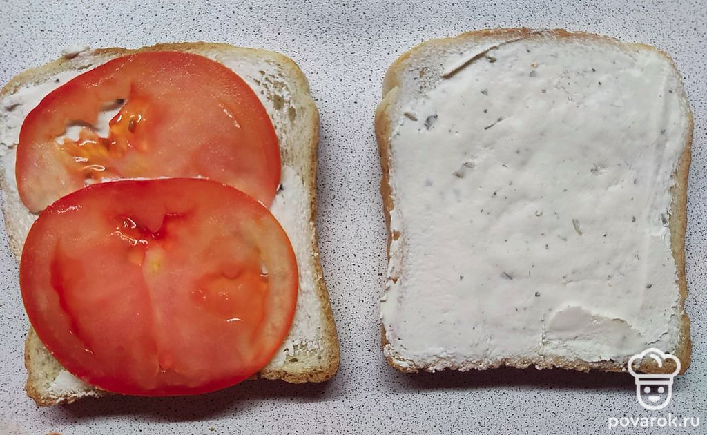 Сверху на один ломтик положить помидор, нарезанный тонкими кружочками.