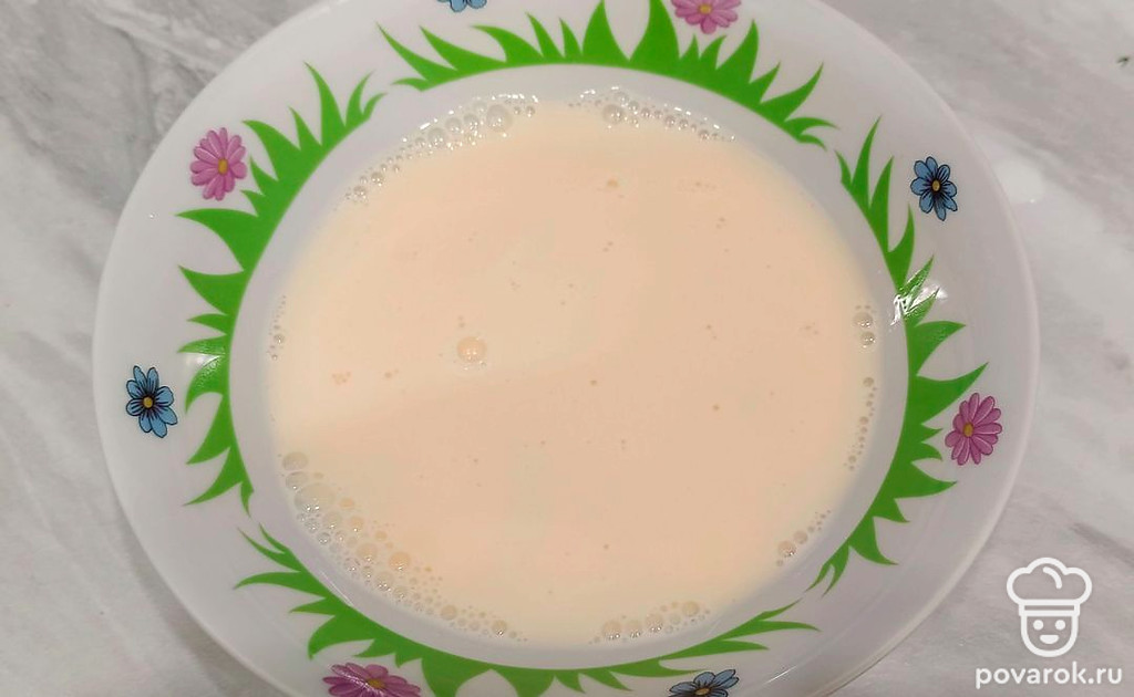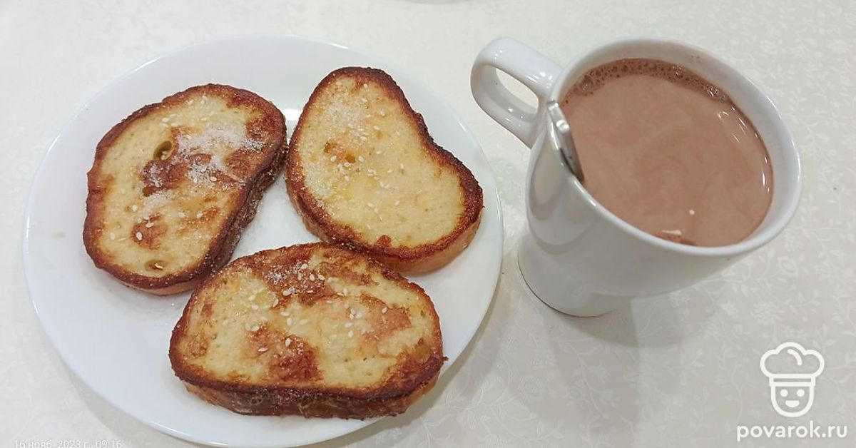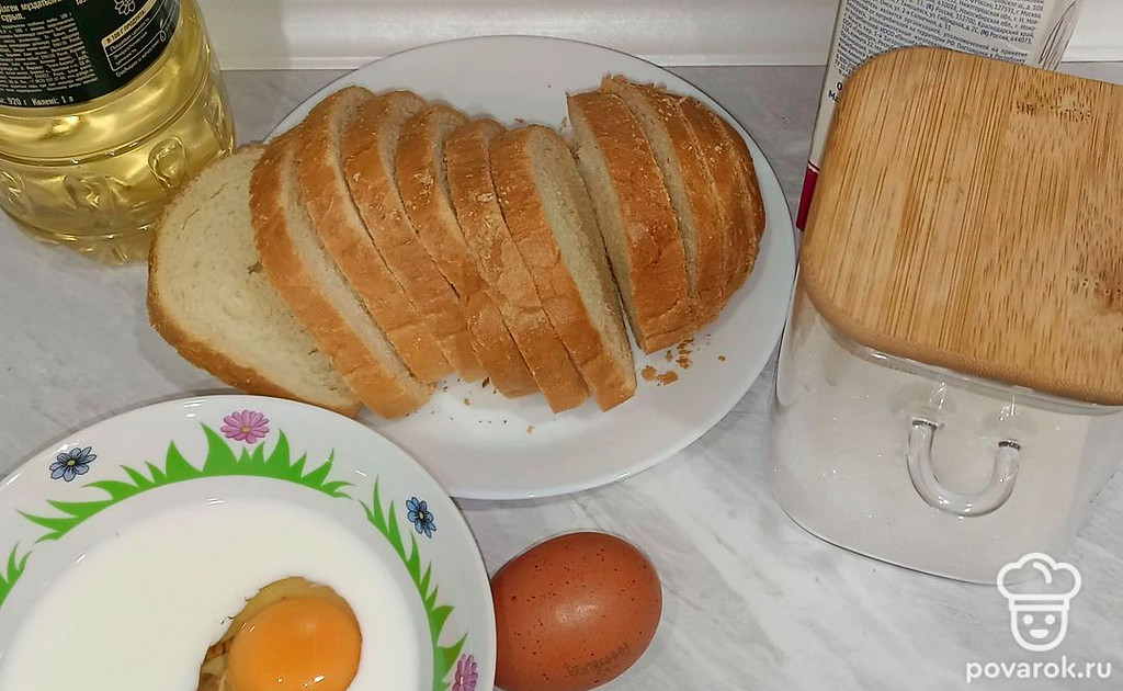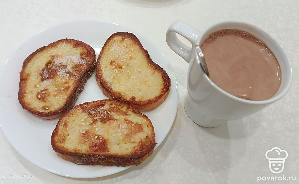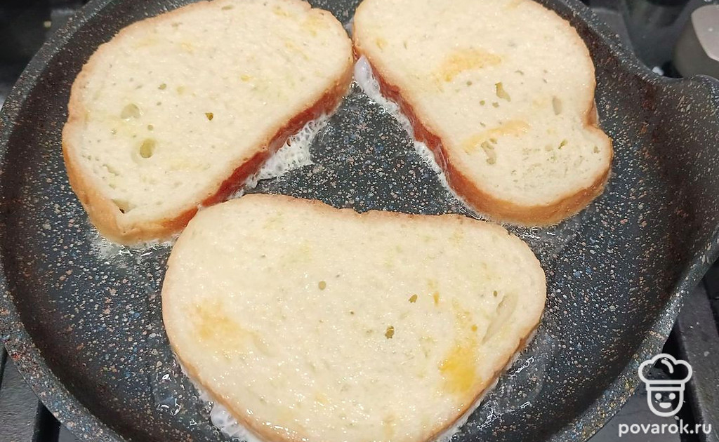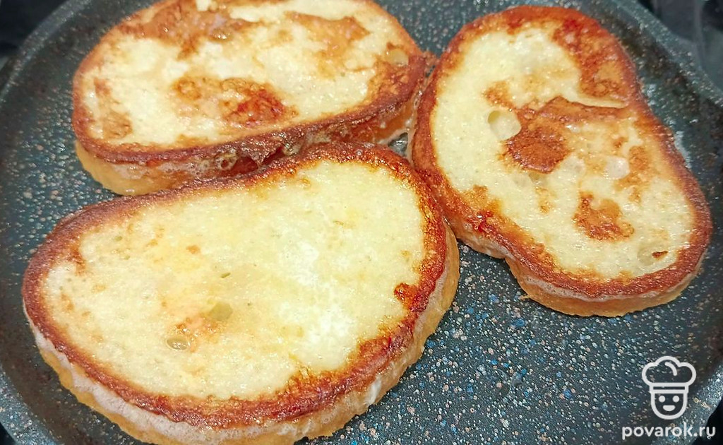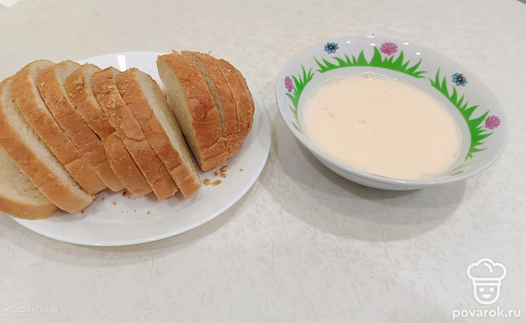 Хлеб обмакнуть с двух сторон в молочно-яичную смесь.
