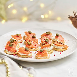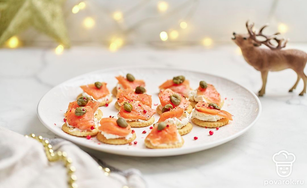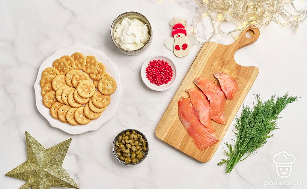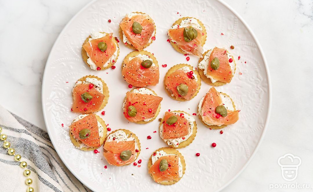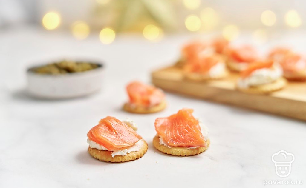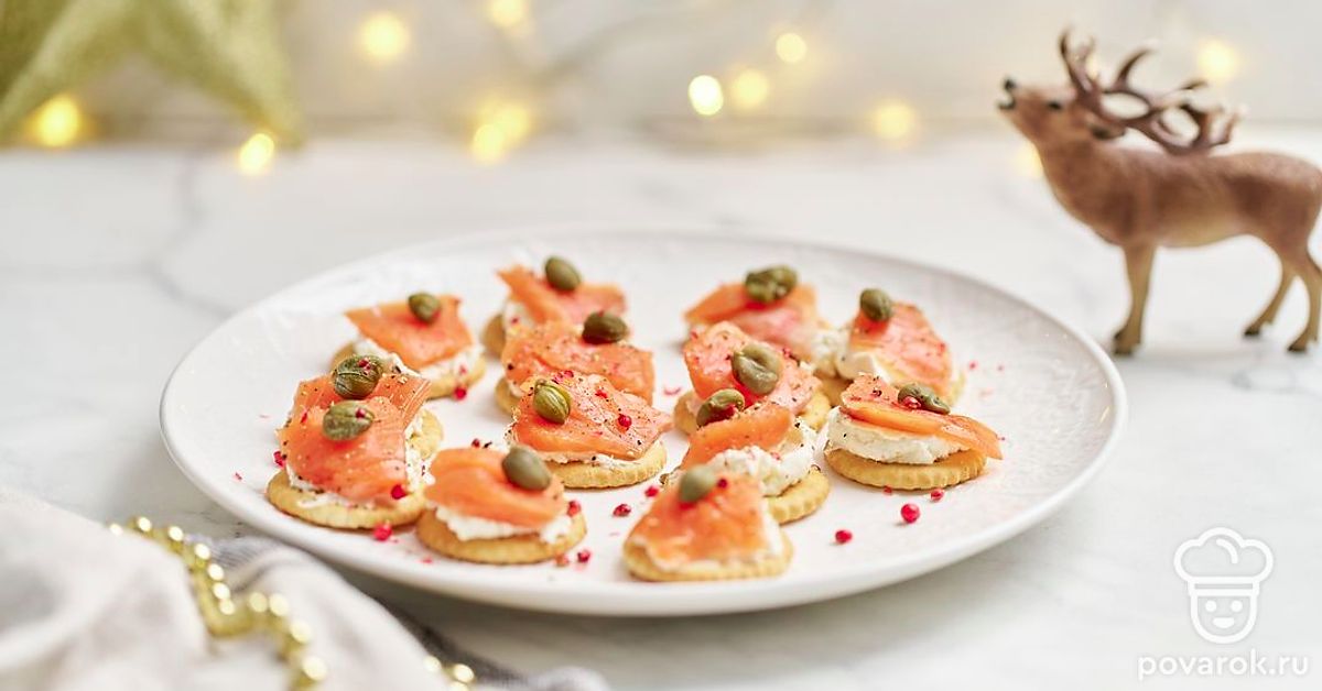 Хрустящие соленые крекеры станут отличной основой для начинки из сливочного сыра и копченого лосося. Получится вкусная и сытная закуска, которая красиво смотрится на столе. Праздничное настроение добавят маринованные каперсы и крошечные кисточки укропа, похожие на елочные иголки. Небольшого количества продуктов хватит для канапе на несколько человек, а готовятся они за считанные минуты.