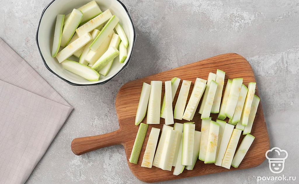 Разрежьте кабачок поперек на три части. Каждую часть нарежьте пластинками толщиной около 5-6 мм. Сами пластинки нарежьте тонкими брусочками.