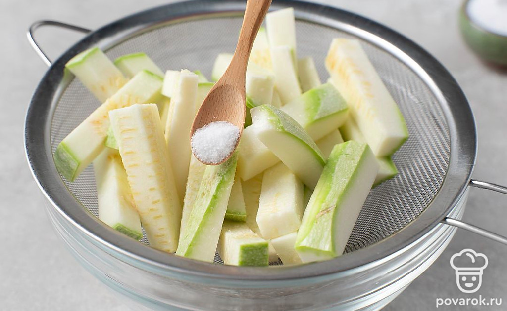 Выложите брусочки кабачка в дуршлаг, равномерно посыпьте солью. Оставьте на 10-15 минут, чтобы овощи дали сок.