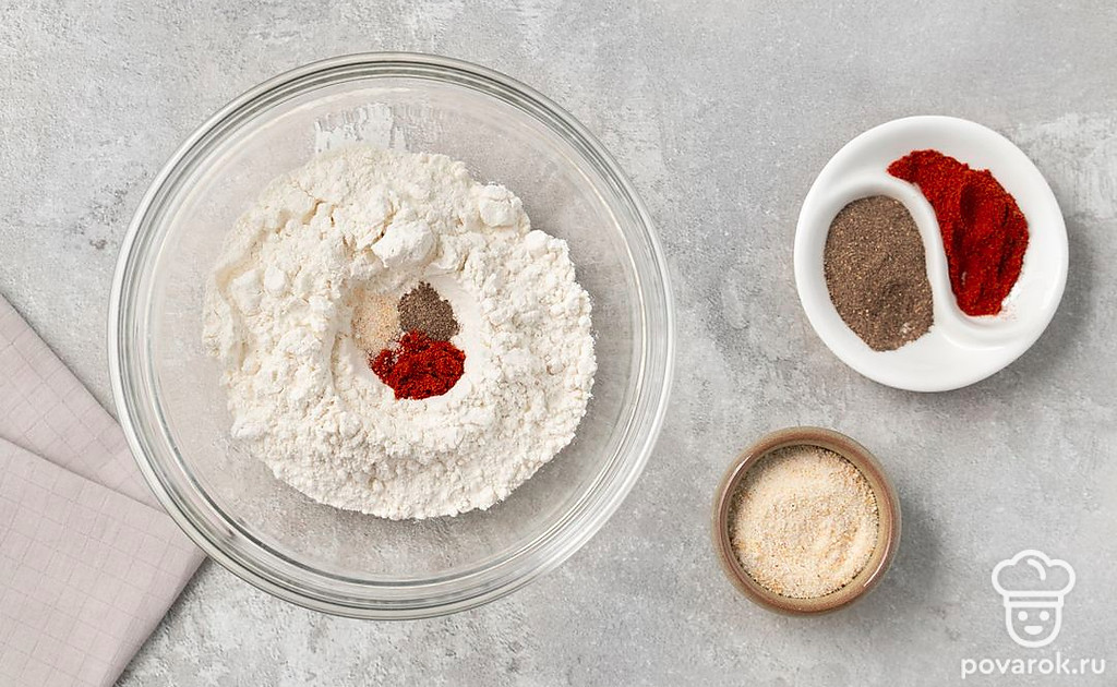 Соедините в большой миске муку, паприку, черный перец и сушеный чеснок. Все хорошо перемешайте.