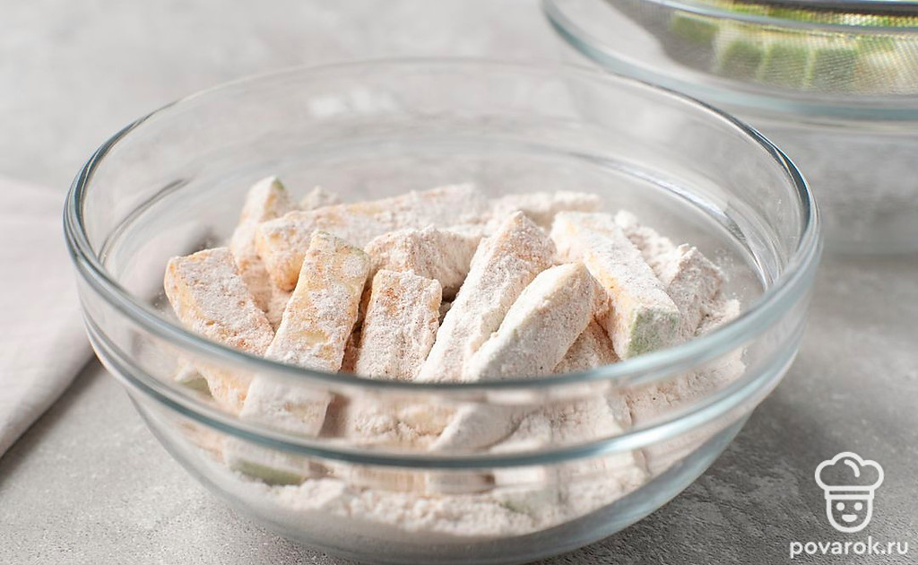 Переложите кабачки в мучную смесь. Закройте миску крышкой и хорошо встряхните, чтобы мука со специями равномерно распределилась по брусочкам.