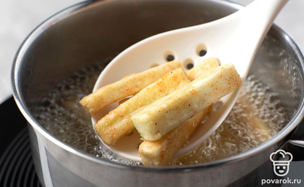Налейте в сотейник растительное масло, хорошо разогрейте его на сильном огне. Опустите кабачки в горячее масло небольшими порциями. Жарьте каждую порцию кабачков по 35-40 секунд. Затем выложите готовые фри на бумажную салфетку, чтобы убрать лишнее масло.