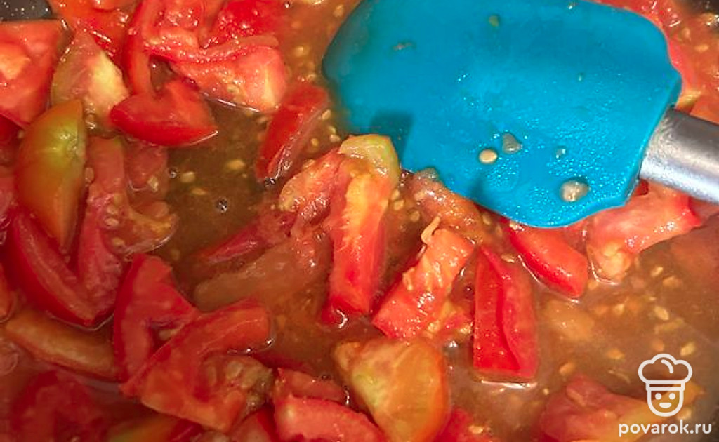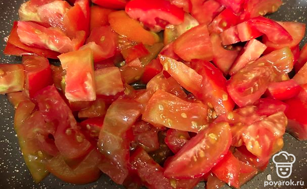 Мелко нарежьте помидоры и поставьте тушиться на среднем огне.