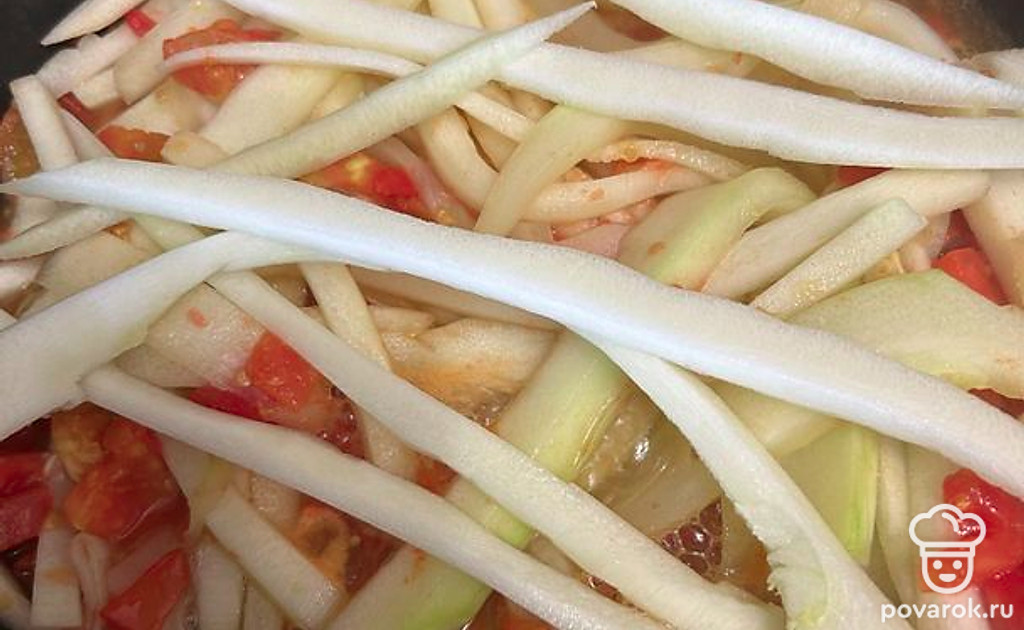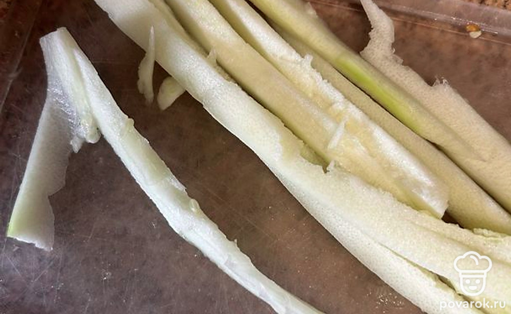 Очистите кабачок, уберите косточки. Постарайтесь как можно тоньше нарезать кабачок на слайсы.