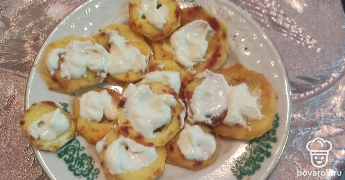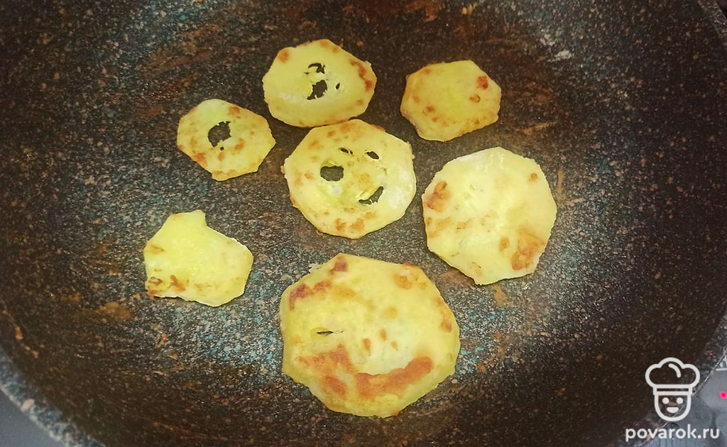 Обваливаем кружочки кабачка в муке. Обжариваем на растительном масле с двух сторон по 2 минуты.