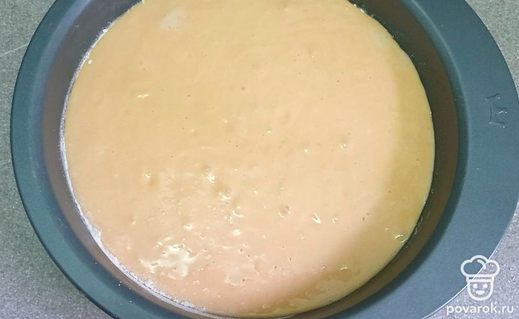 Все хорошо перемешайте, вылейте в смазанную растительным маслом форму диаметром 24 сантиметра. Поставьте в разогретую духовку.