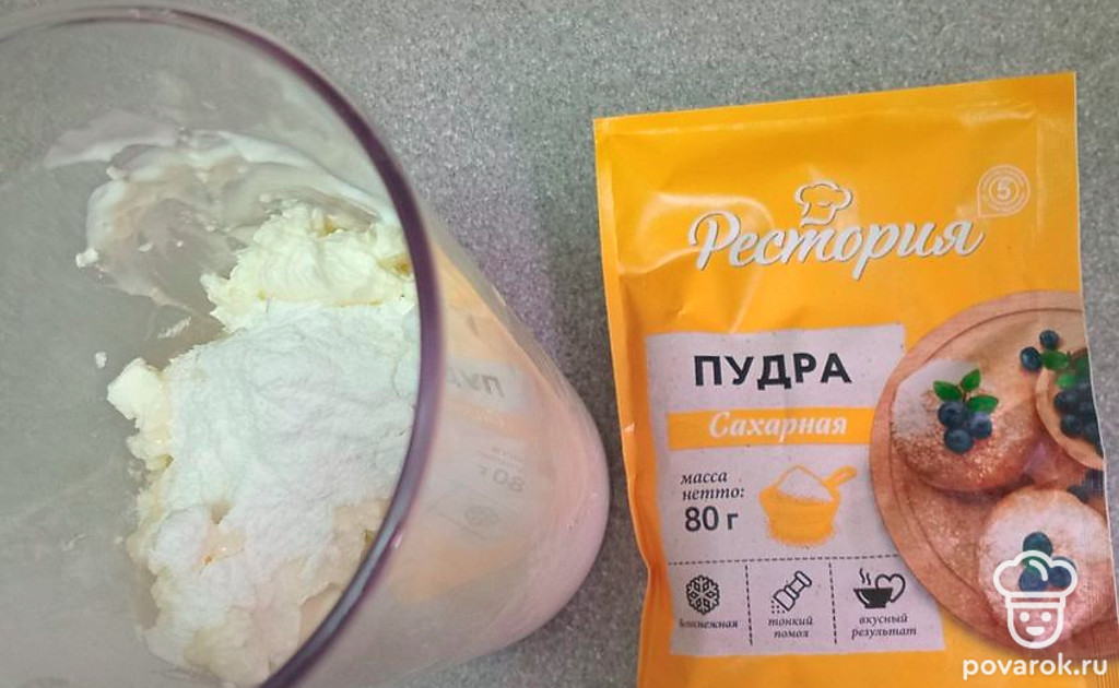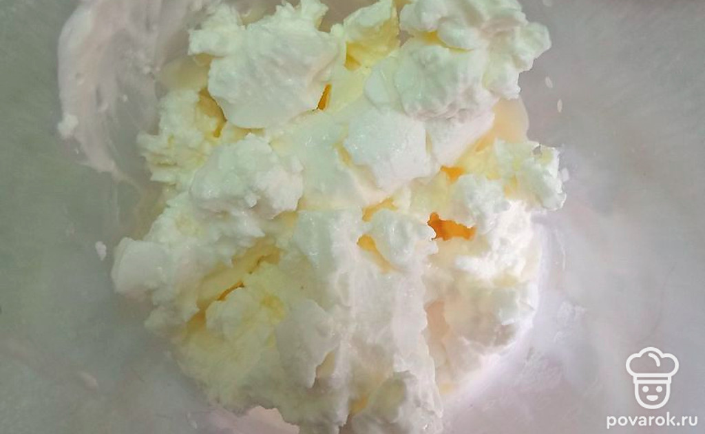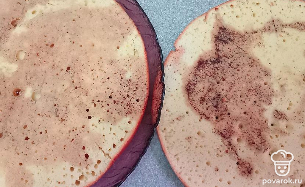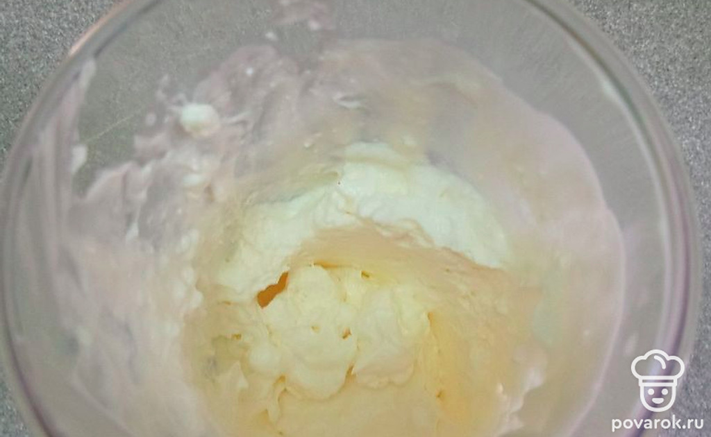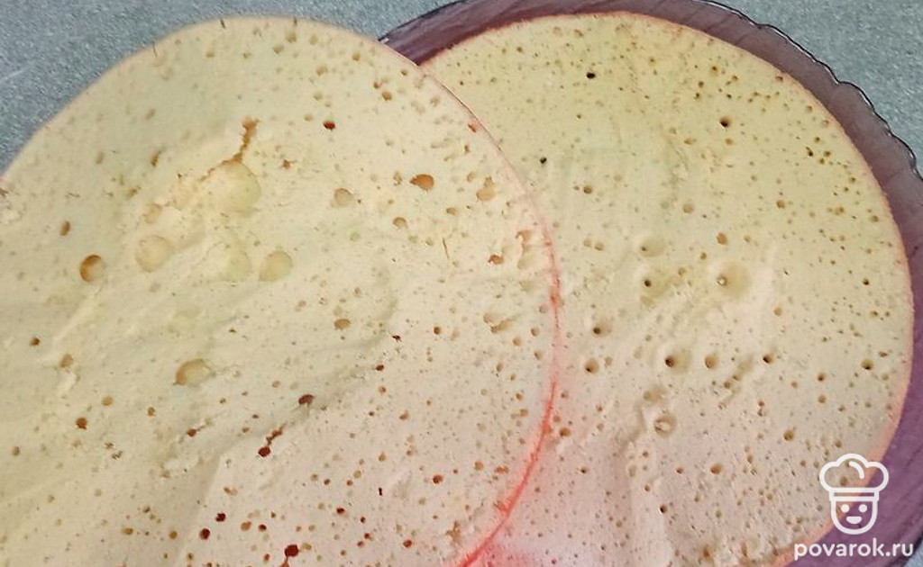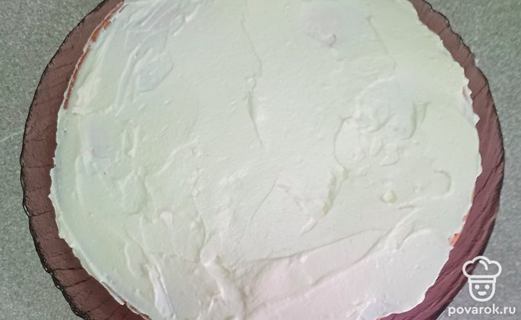 Крем разделите на три части. На один корж выложите часть крема, сверху положите второй корж и намажьте второй частью крема.