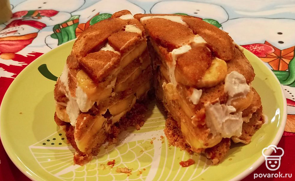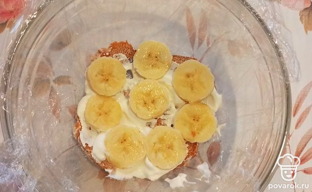 Нарежьте бананы кружочками и выложите на пряники. Повторите так еще один слой.