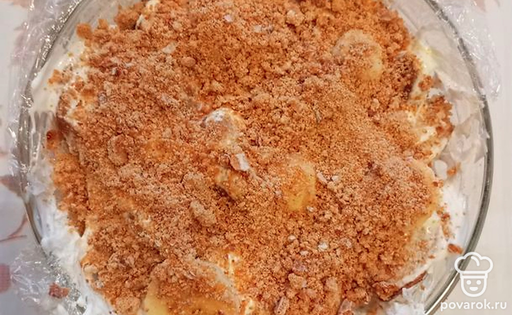 Остатки пряников измельчите, посыпьте сверху получившийся торт. Поставьте в холодильник на 2 часа.
