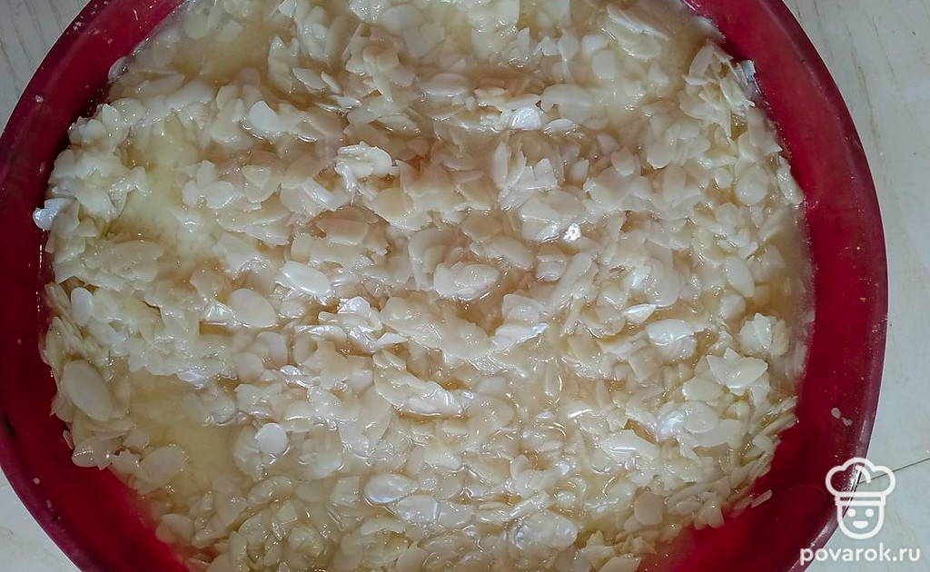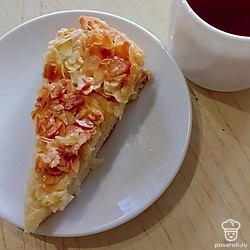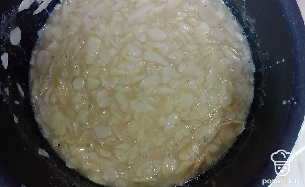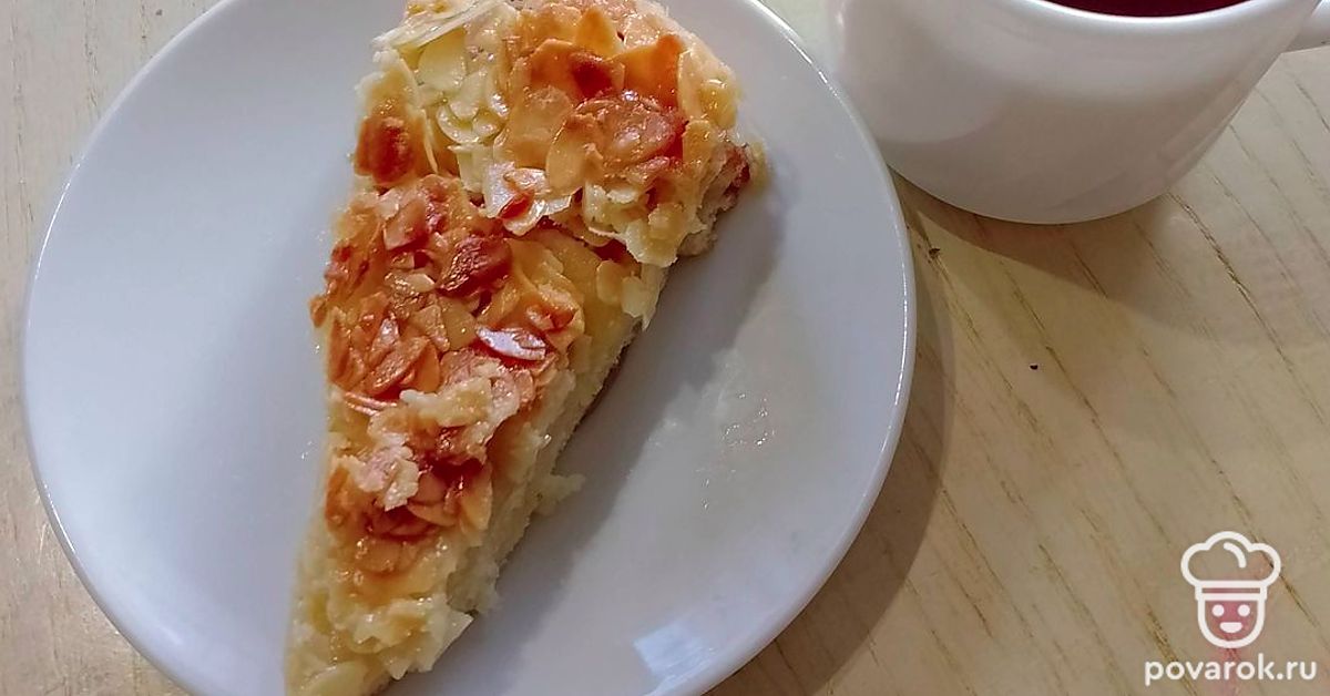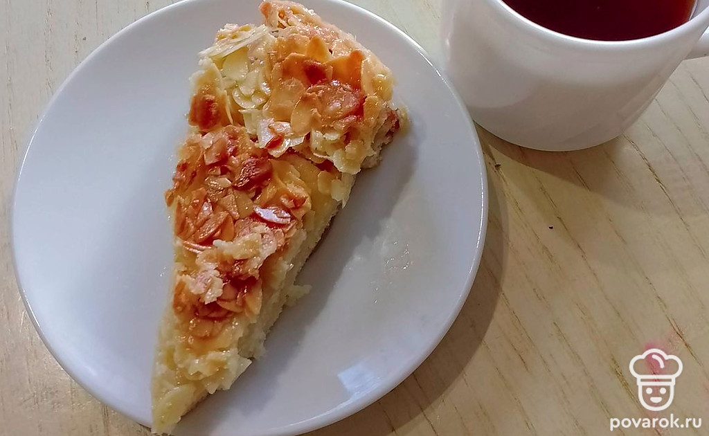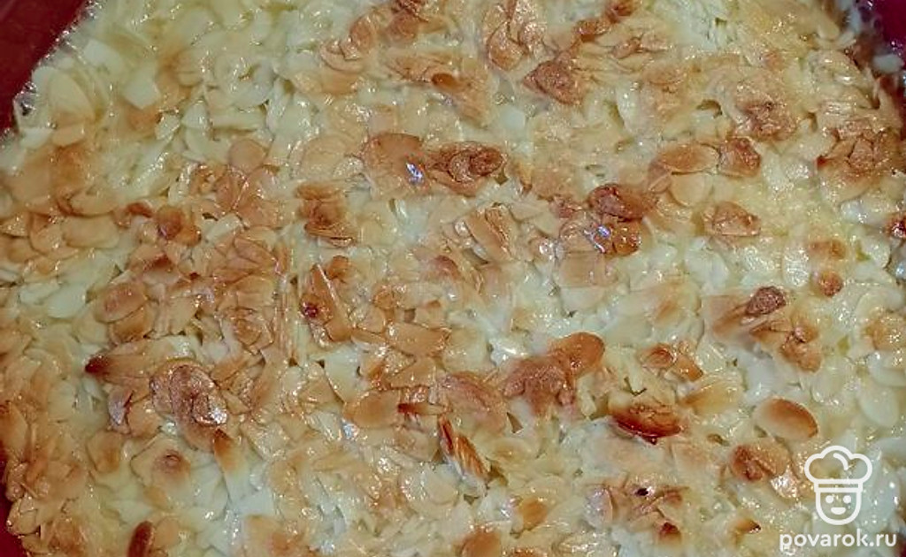 Тесто поставьте в духовку на 180 градусов. Томите до полуготовности. Залейте массу с миндальными лепестками.