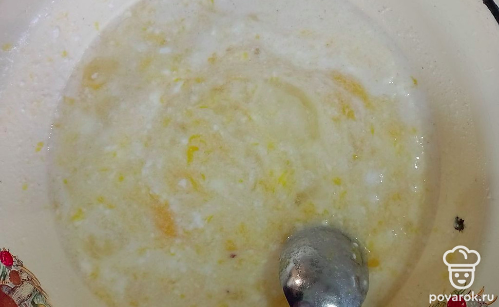Смешайте кефир, 3 яйца, стакан сахара, разрыхлитель.