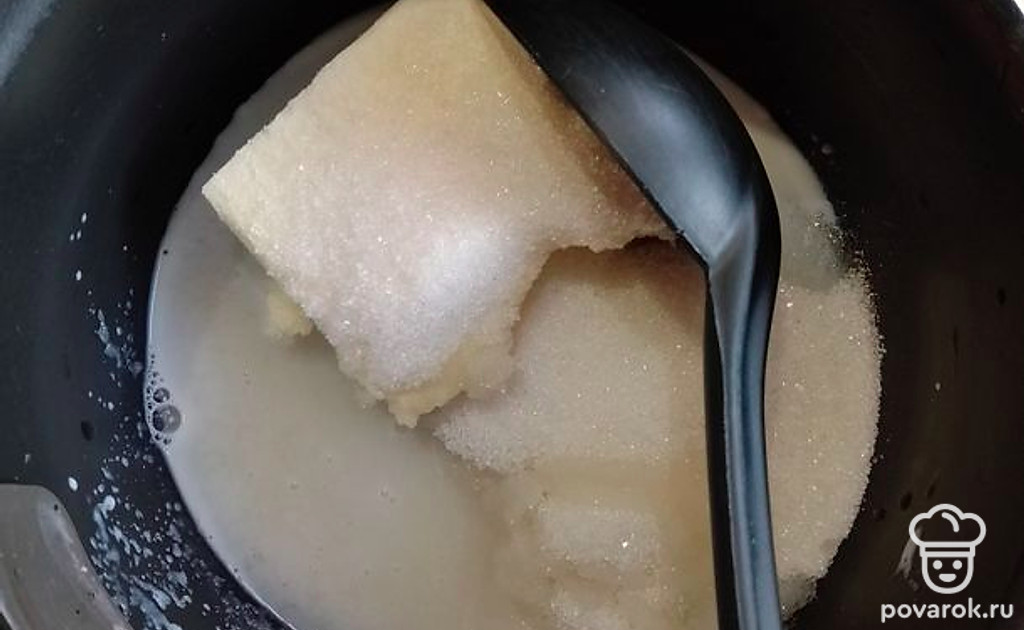 Смешайте стакан сахара, 5 столовых ложек молока, 150 грамм сливочного масла. Растопите.