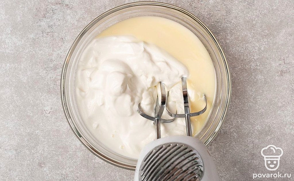 Смешайте в миске миксером сметану со сгущенкой. Масса должна стать гладкой и воздушной.