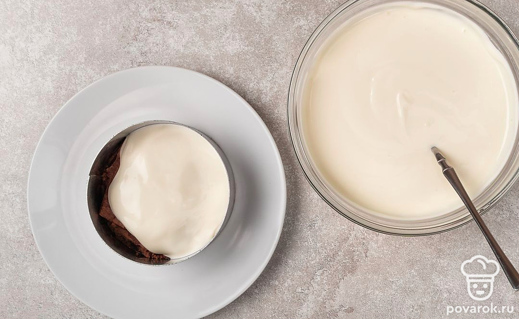 Смажьте первый слой кремом. Повторяйте слои из печенья и крема, пока не закончатся все ингредиенты.