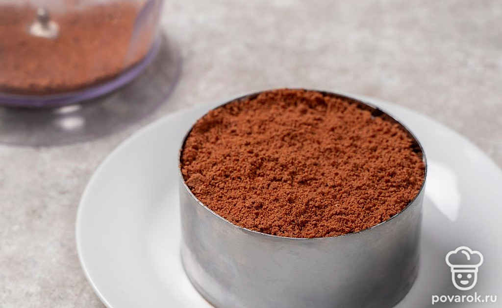 Отложенное печенье измельчите до состояния крошки в блендере или руками. Посыпьте ею торт. Поставьте десерт в холодильник на 2 часа застывать.