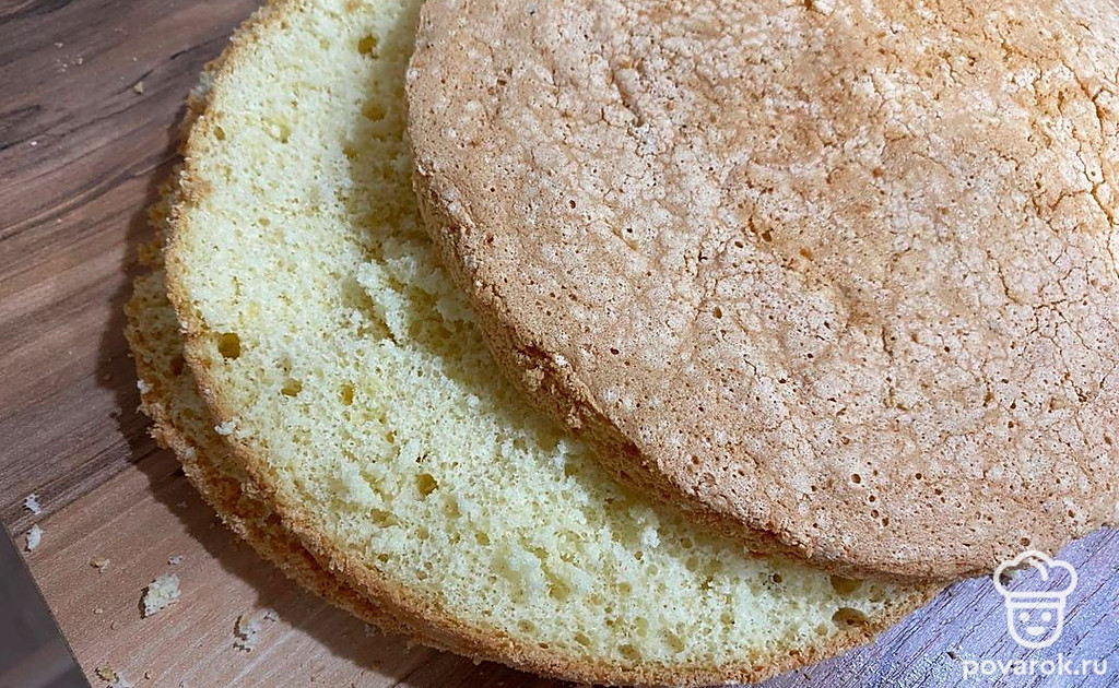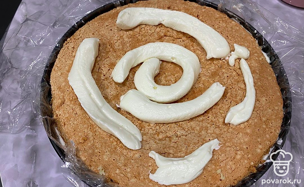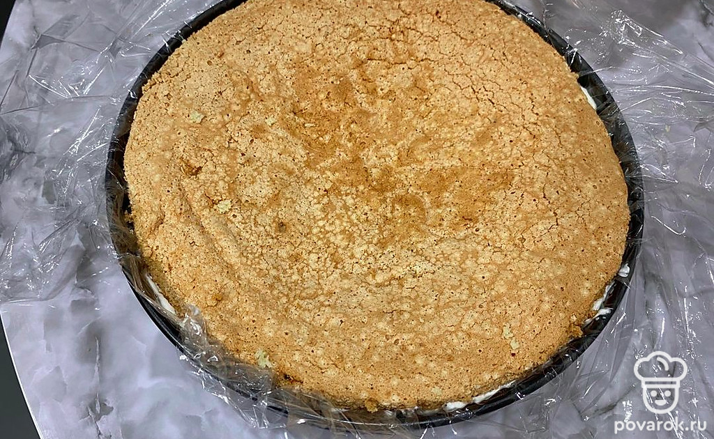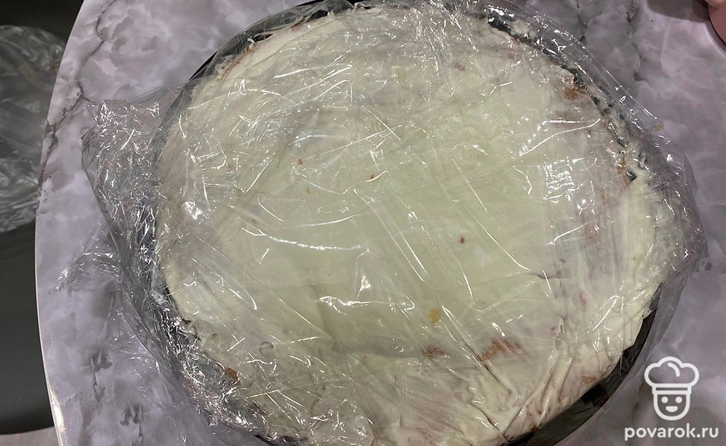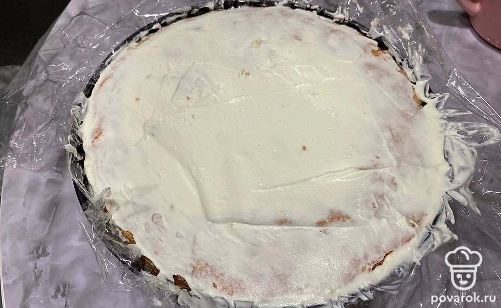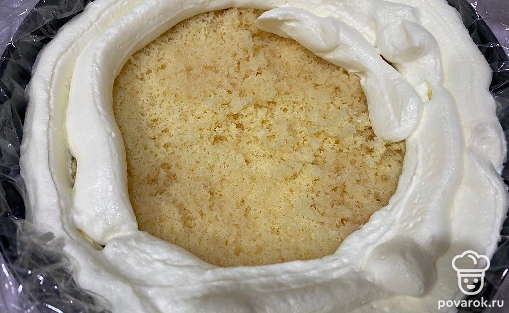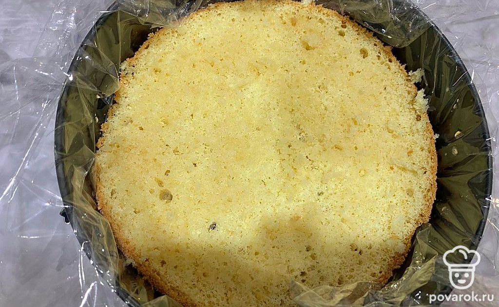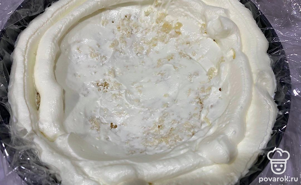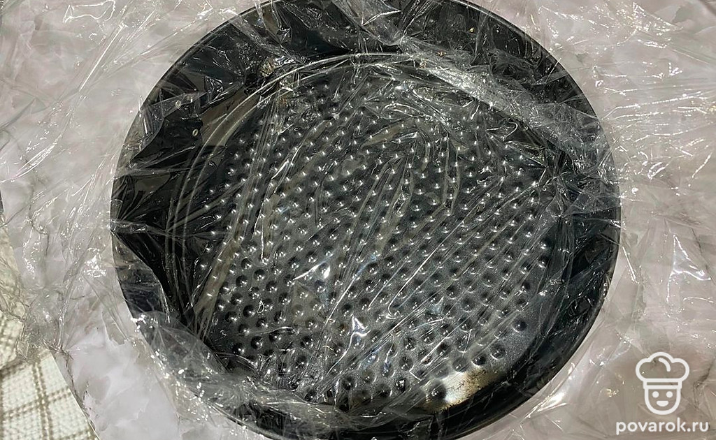 Оборачиваем форму пленкой и начинаем сборку торта.