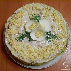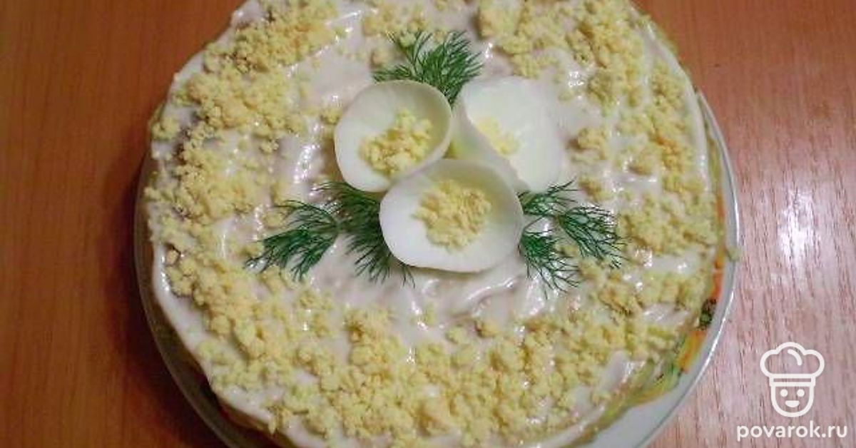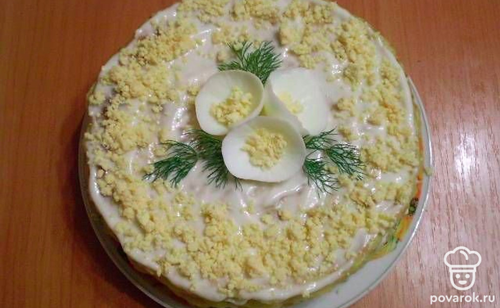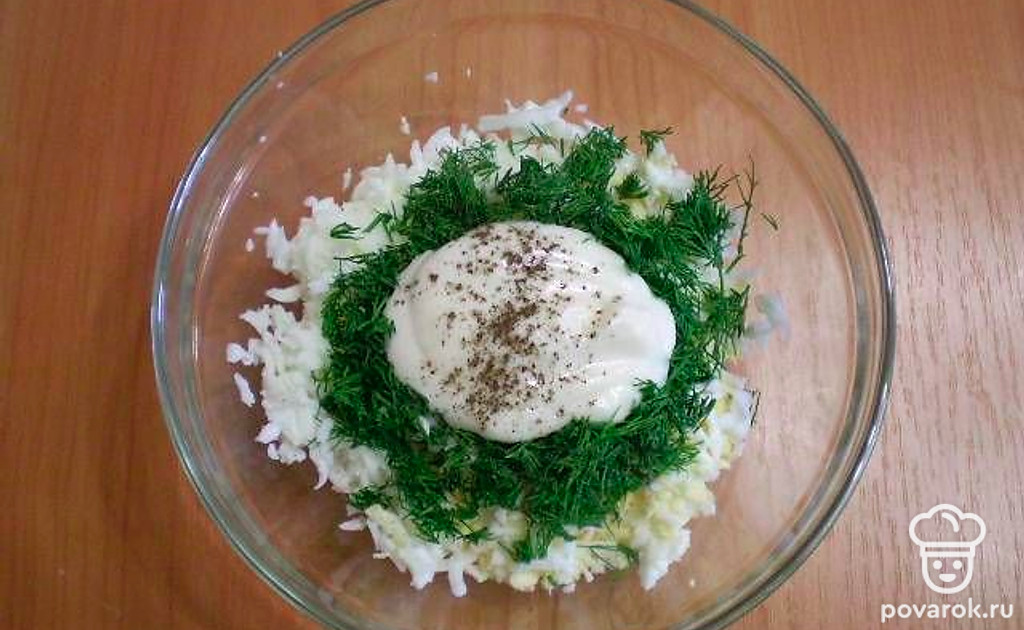 Можно украсить тертыми желтками и лодочками из вареного белка.